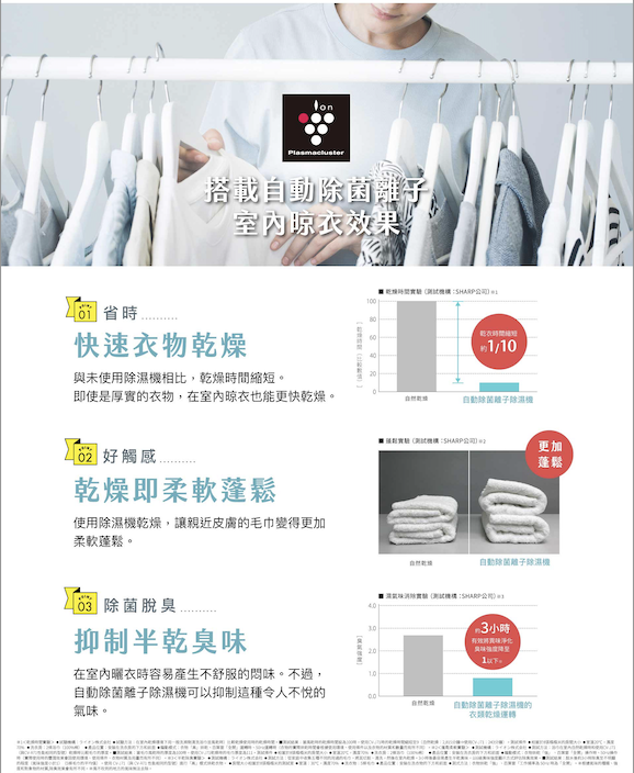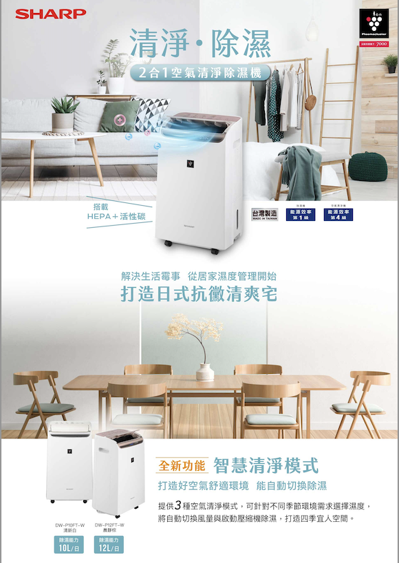 SHARP 夏普SHARP夏普 10L 自動除菌離子 2合1空氣清淨除濕機 DW-P10FT-W 除濕能力10L/日 能源效率1級 自動除菌離子空氣清淨除菌行程
