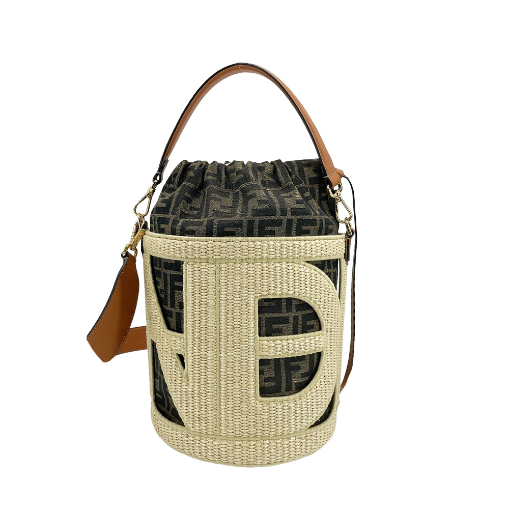 品牌:Fendi型號:8BT364材質:天然稻草.帆布內裡材質:帆布尺寸:約 20 x 20 x 27 cm格式:束口開口;無夾層可否放置A4:否配件:防塵袋.背帶1 提把1來源:歐洲真品平行輸入