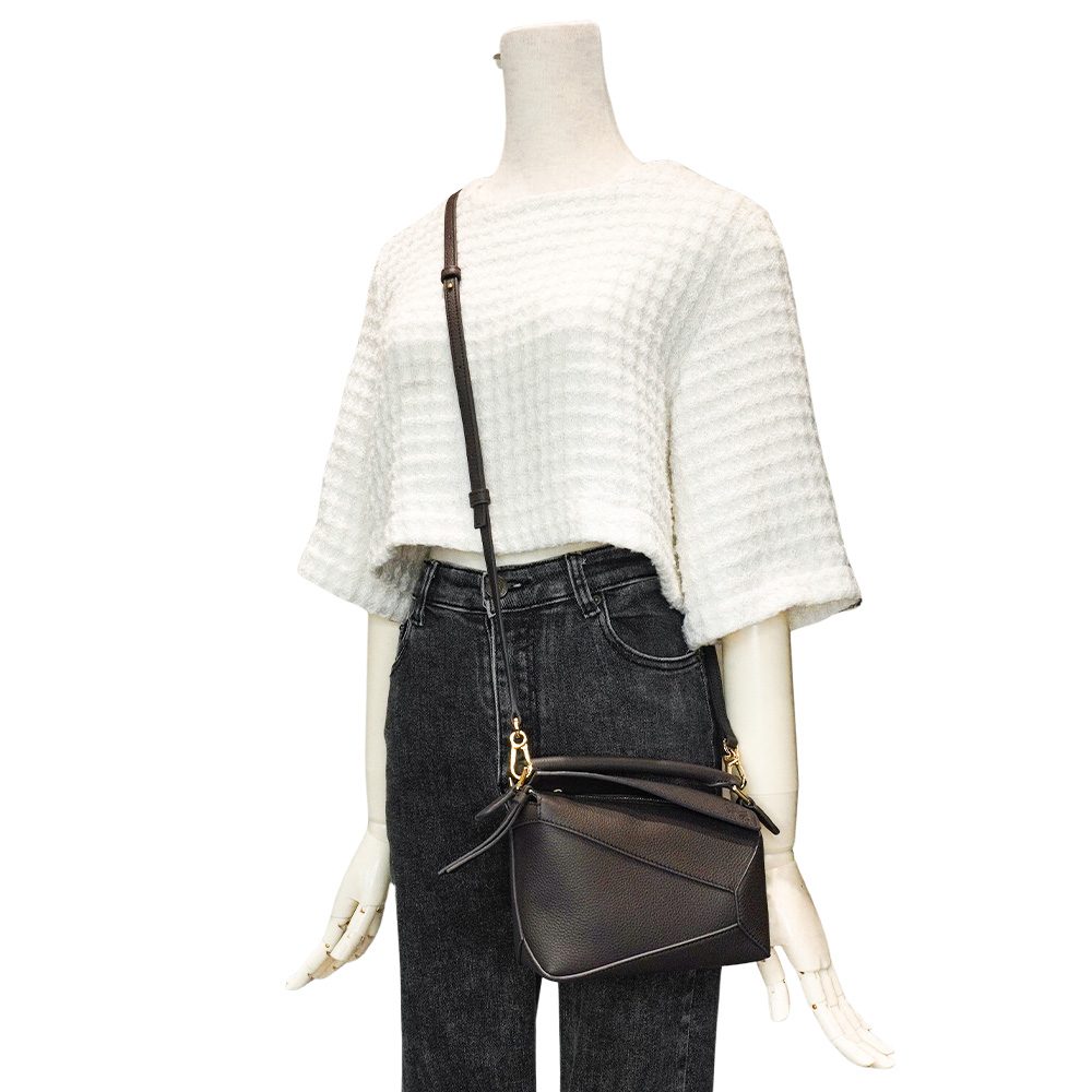 品牌:Loewe型號:A510P88X16材質:牛皮內裡材質:紡織襯裡尺寸:約 18 x 12.5 x 8 cm格式:拉鍊開合;無夾層可否放置A4:否配件:防塵袋.背帶有無底珠 : 無來源:歐洲真品平行輸入