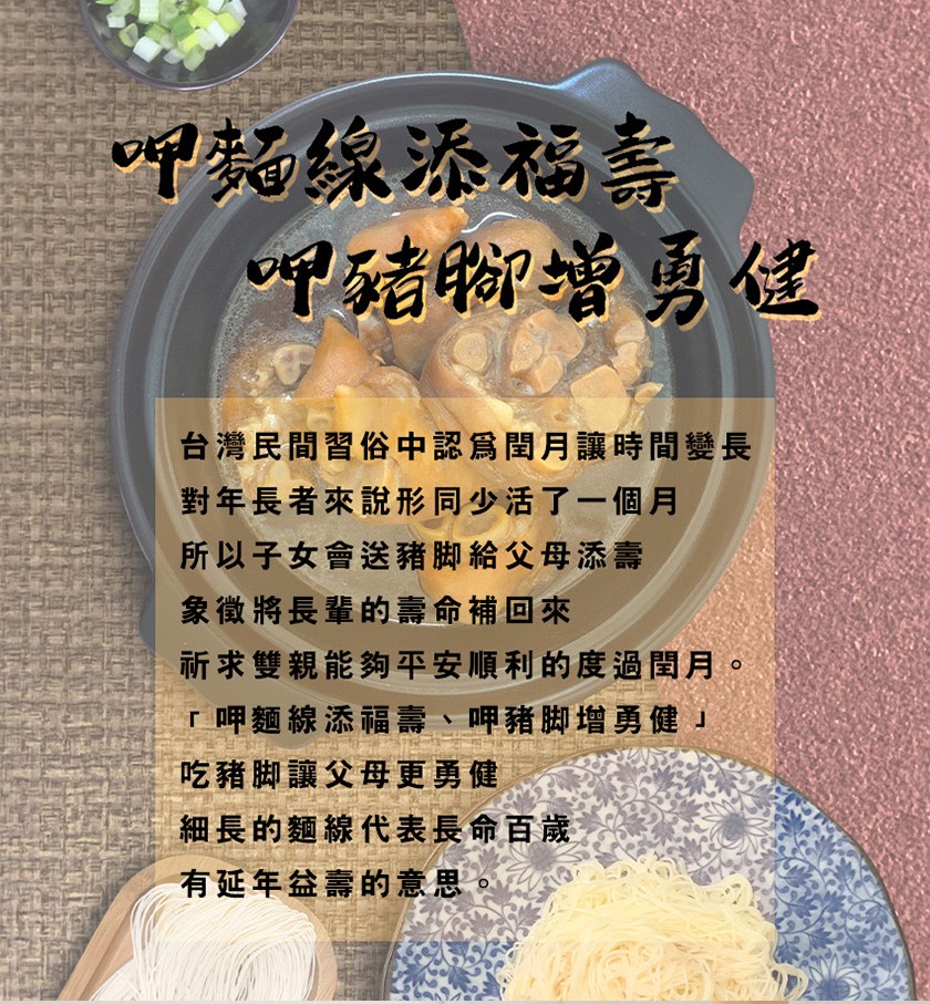 (一包豬腳600G+一包麵線60G 總重660G) 😘呷麵線添福壽 呷豬腳增勇健😘 💞台灣民間習俗中認為閏月讓時間變長 對年長者來說形同少活了一個月 所以子女會送豬脚給父母添壽 象徵將長輩的壽命補回來 祈求雙親能夠平安順利的度過閏月。 「呷麵線添福壽、呷豬腳增勇健」 吃豬脚讓父母更勇健 細長的麵線代表長命百歲 有延年益壽的意思。💞