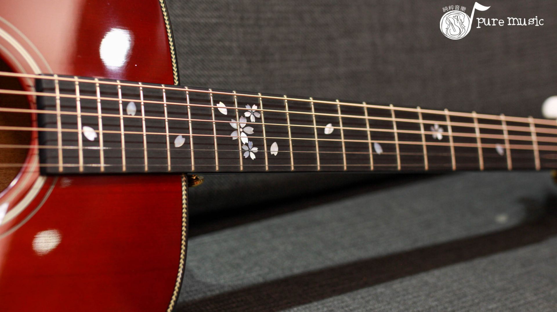 這款吉他的指板上鑲嵌了精美的櫻花圖案,這也是由夜櫻而來。