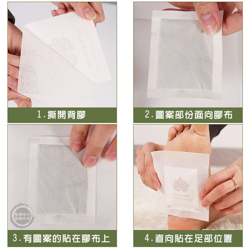 ▶睡前先洗腳或者泡腳後使用足貼,將足貼貼於腳底部位對應穴位,或者不適的患處,早晨起床之後揭下即可黏貼時有正反面之分,請將有明顯小孔面朝腳底,印字光滑面黏在膠貼上。
