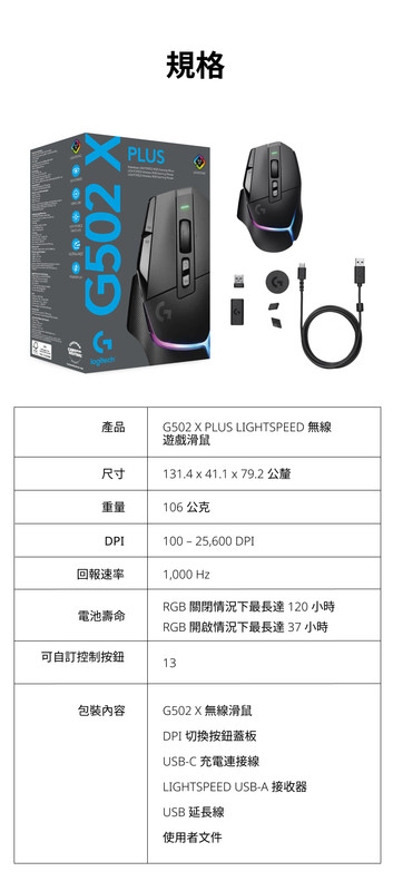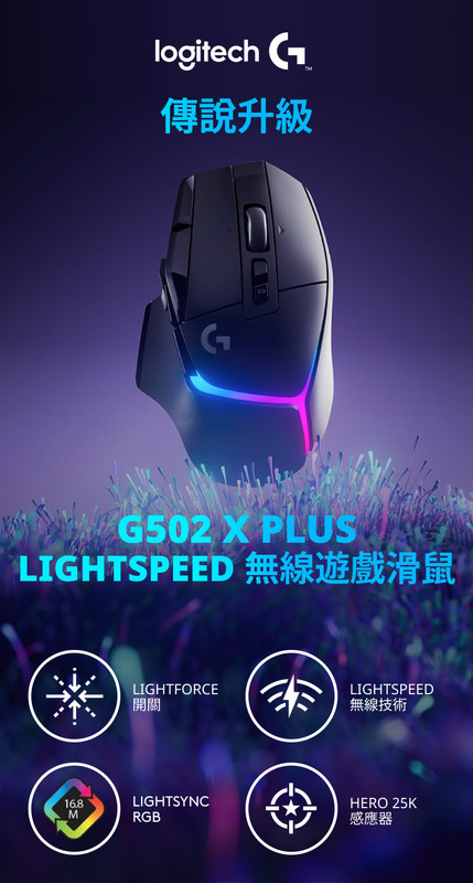 G502 X Plus 炫光高效能無線電競滑鼠(黑/白)