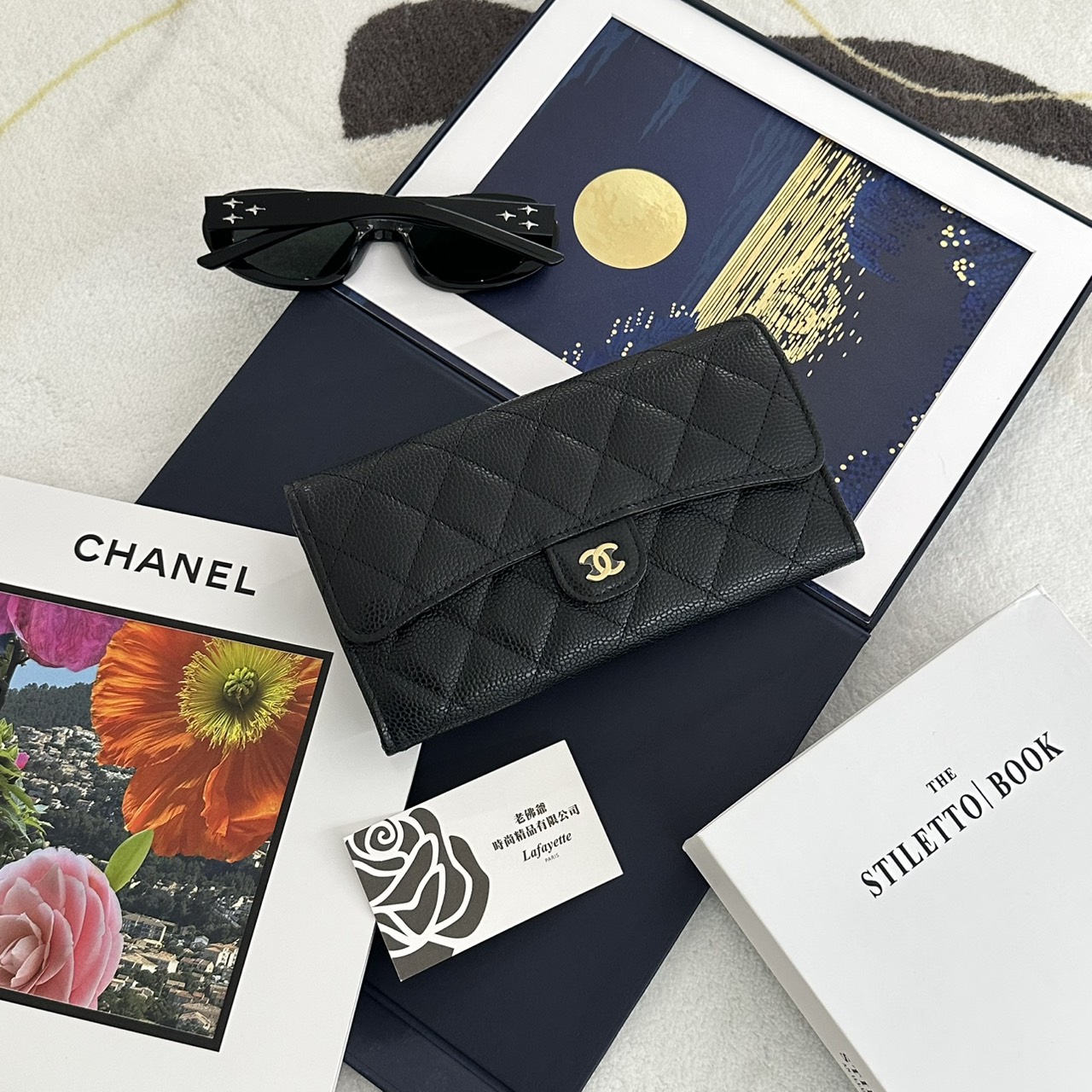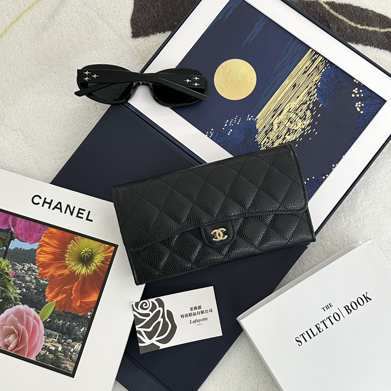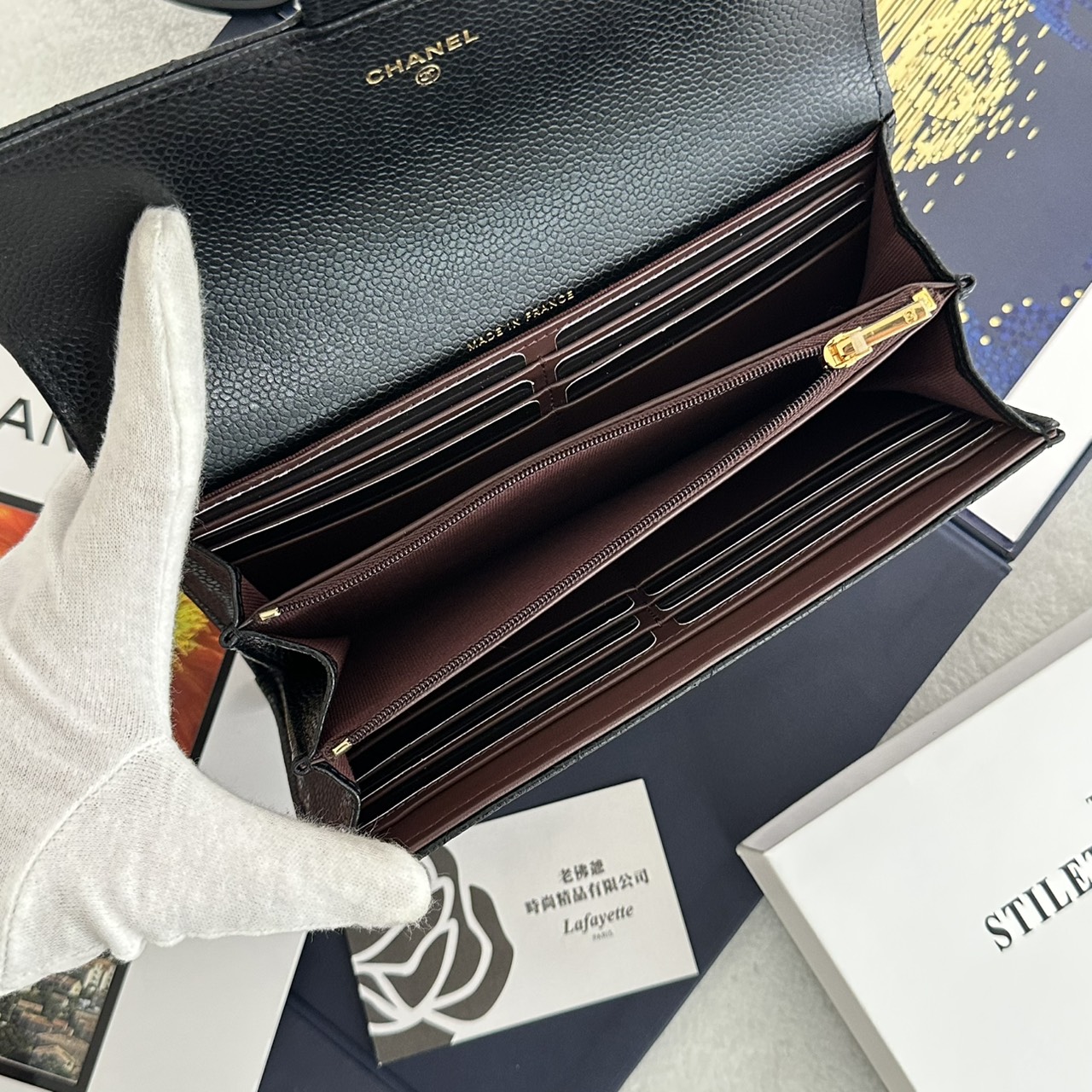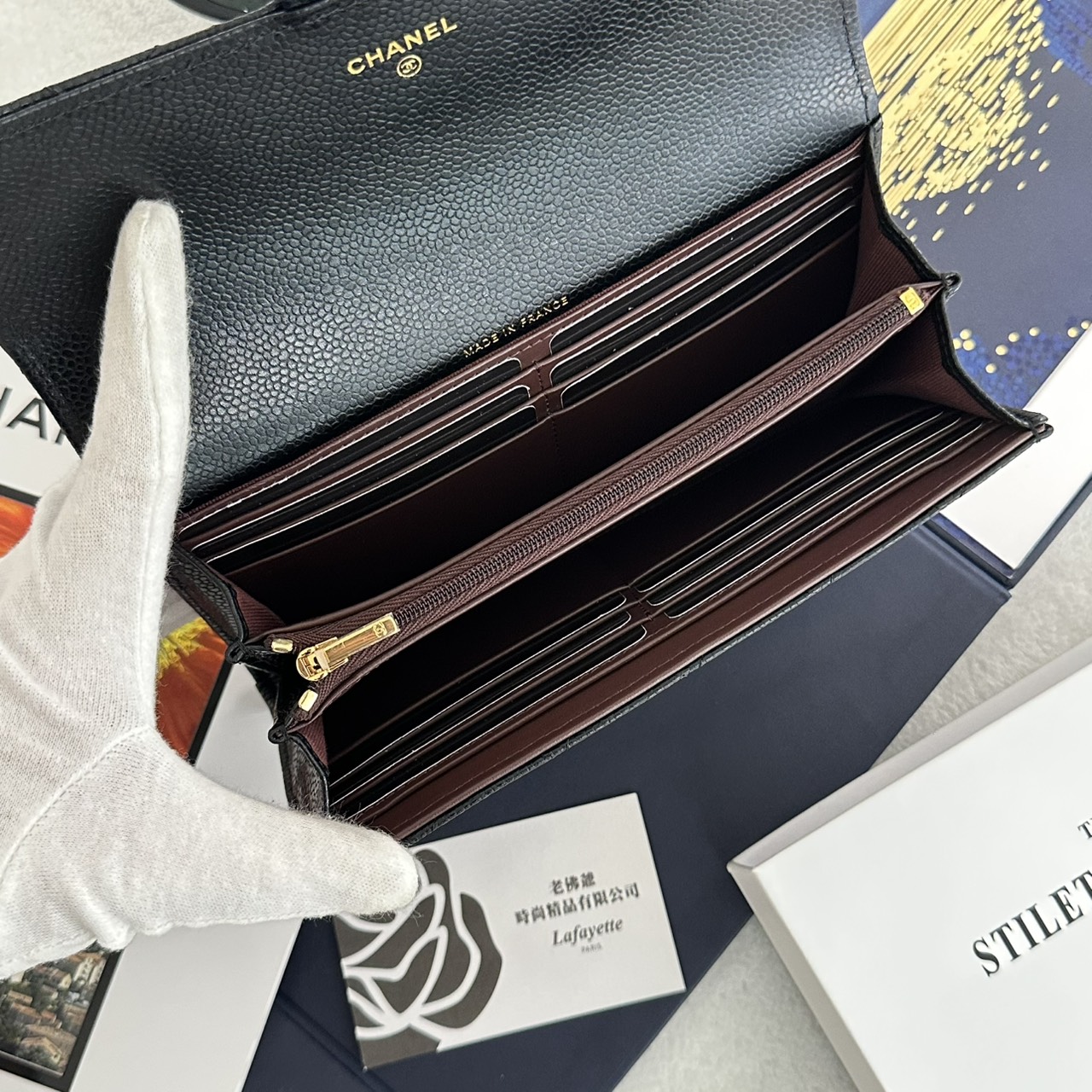 CHANEL COCO 黑金菱格紋荔枝小牛皮 信封長夾