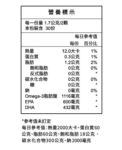 • 成分:濃縮魚油、維生素E(抗氧化劑)