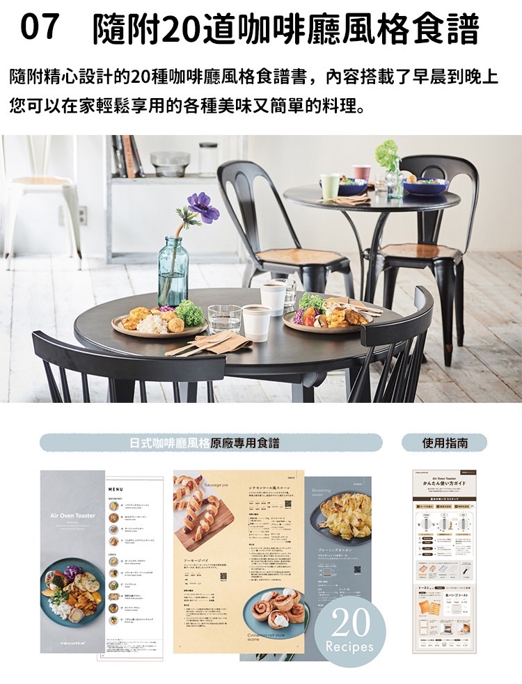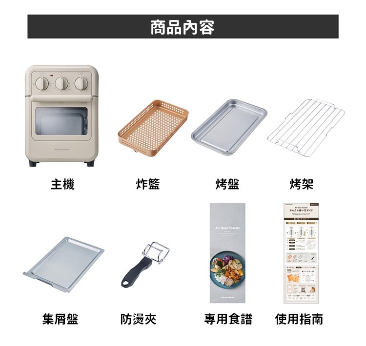 包裝內容:主機、烤盤、炸籃、烤架、防燙夾、集屑盤、中文操作手冊含保固卡、使用指南、20道精緻食譜