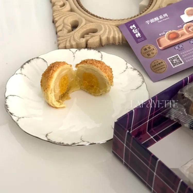 堅持純手工製作,多層次鬆軟酥皮,裹著令人驚艷的內餡,嚴選紅土鹹蛋黃經特別烘烤後研磨成金黃細沙,加上白鳳豆餡與特等紐西蘭奶油。揉和成綿柔細膩的晶沙餡。灑上頂級芝士粉,甜而不膩,入口即化,再咬碎鹹蛋黃那沙沙獨特的口感,渾然天成的典藏品味。