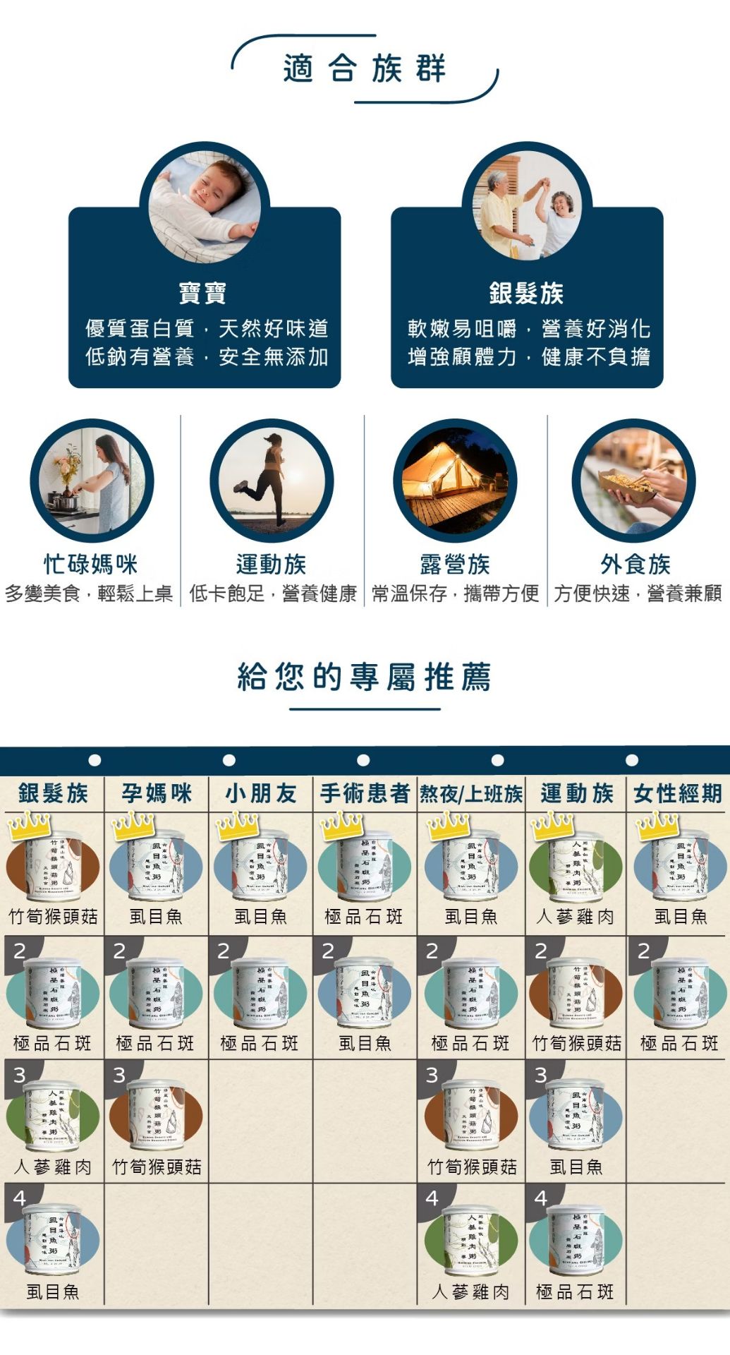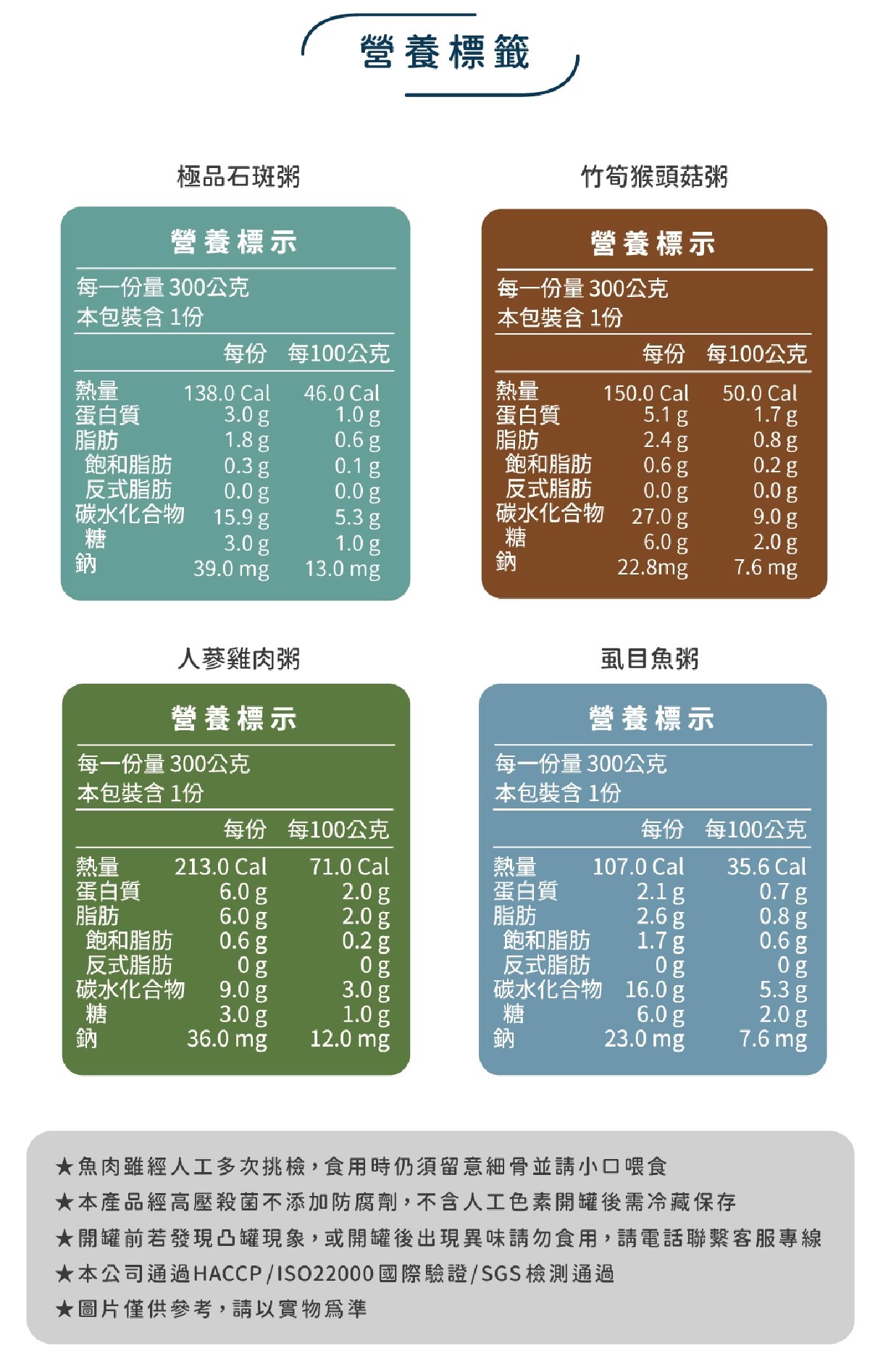 台灣漁民養殖的龍膽石斑和虱目魚與天然食材結合 低卡健康 攜帶方便 經高壓殺菌 不添加防腐劑 不含人工色素 開罐後需冷藏保存 幸福往源於最純粹的形式 用最原始的初心,做最幸福的產品