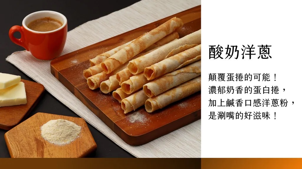 顛覆您對蛋捲的想像─酸奶洋蔥蛋捲。當蛋捲灑上特選的酸奶洋蔥粉,微酸優格奶香以及鹹香洋蔥粉的香氣,