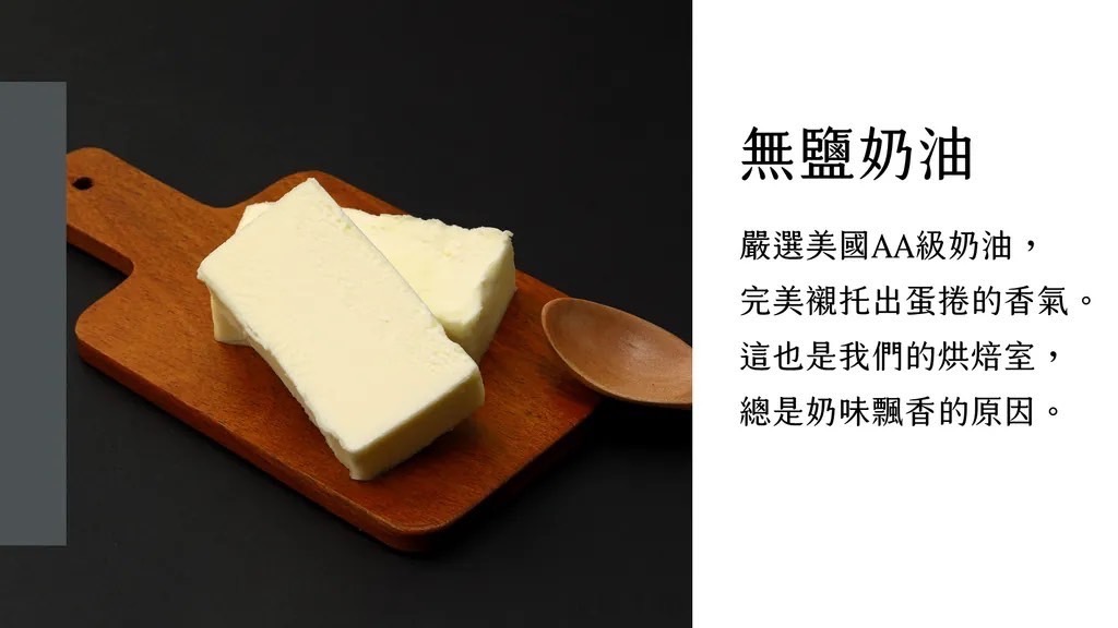 唯有奶油才能讓蛋捲自帶香濃的奶香味。我們嚴選來自美國AA級的無鹽奶油,加入蛋白、麵粉混合而成的麵糊,在低溫焙烤後更是香氣十足,令人無法自拔。