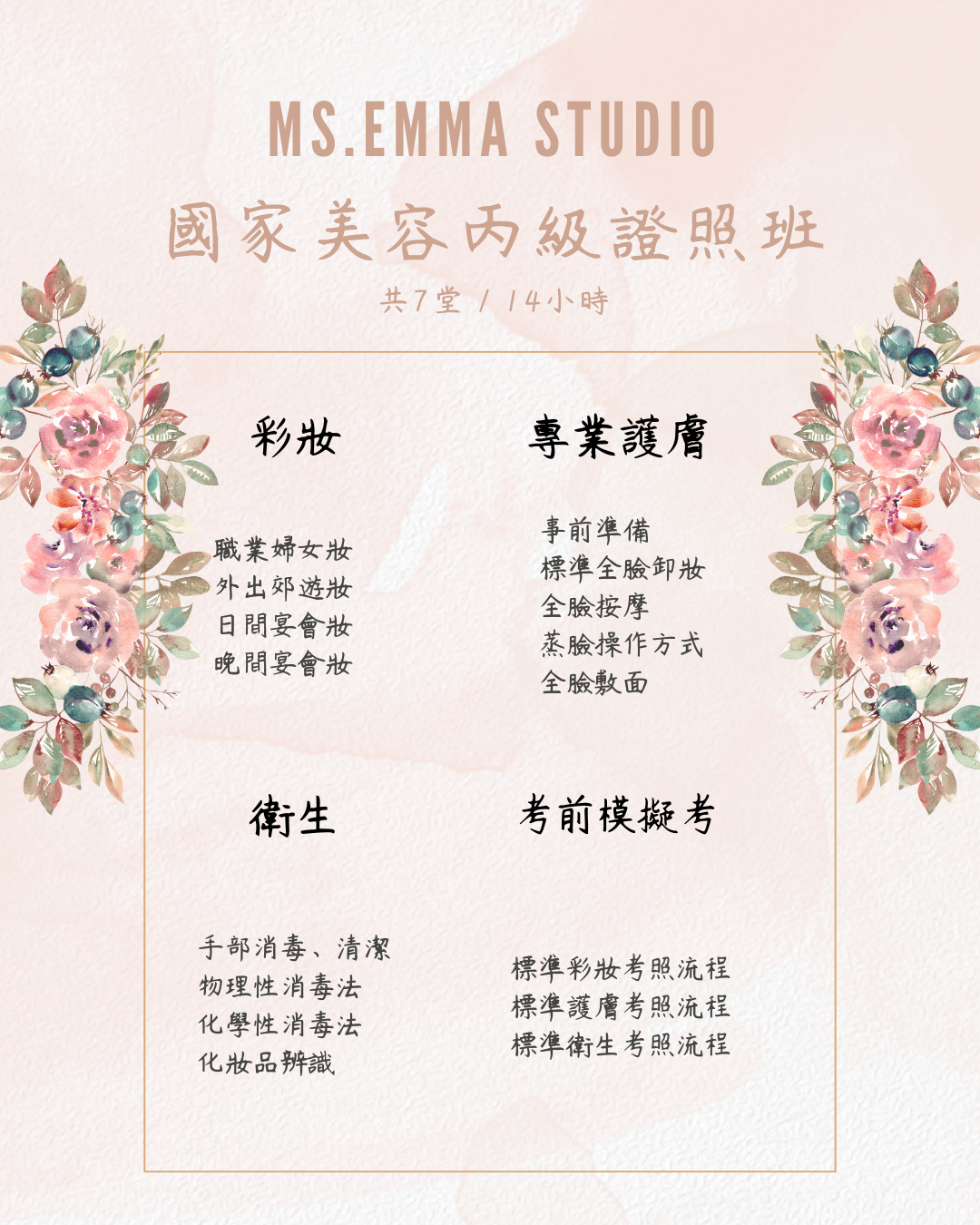 課程包含美甲、韓式皮膚管理、美睫、翹睫、熱蠟、採耳、國際證照輔導、國家美容丙乙級證照班