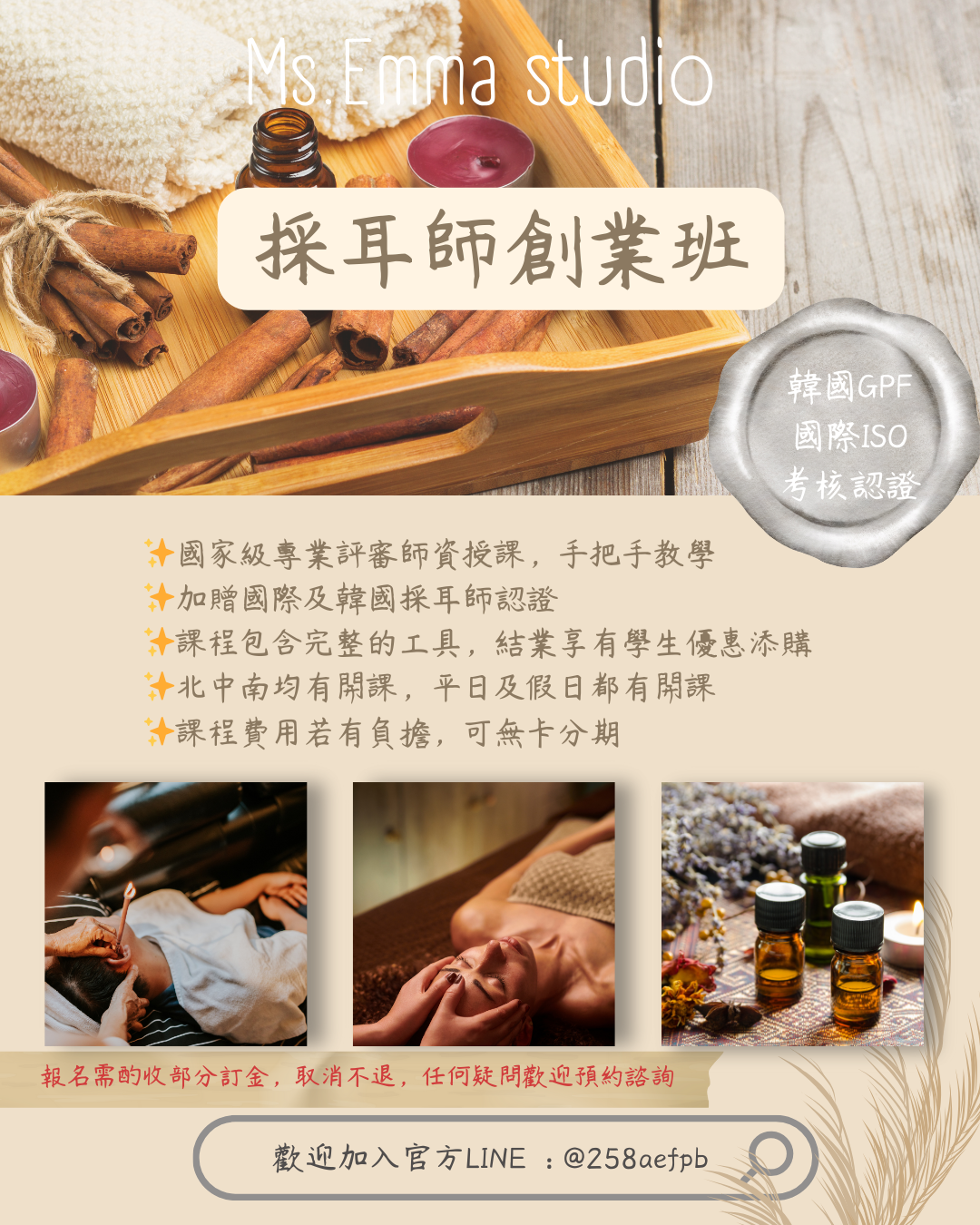 A :基本上採耳適用於美業所有的人學習第二專長,快速上手且可以邊學習邊做客人,技術服務得好,客人就會固定回流,但台灣目前尚無正式證照,台灣目前沒有屬於自己的品牌,更沒有授權、證書,艾瑪學院創辦人身為英國ISO審核師及韓國在台正副會長,引進國際認證,此課程則是以國際GPF認證為輔導,讓學員創業擁有更大的保障及公信力。