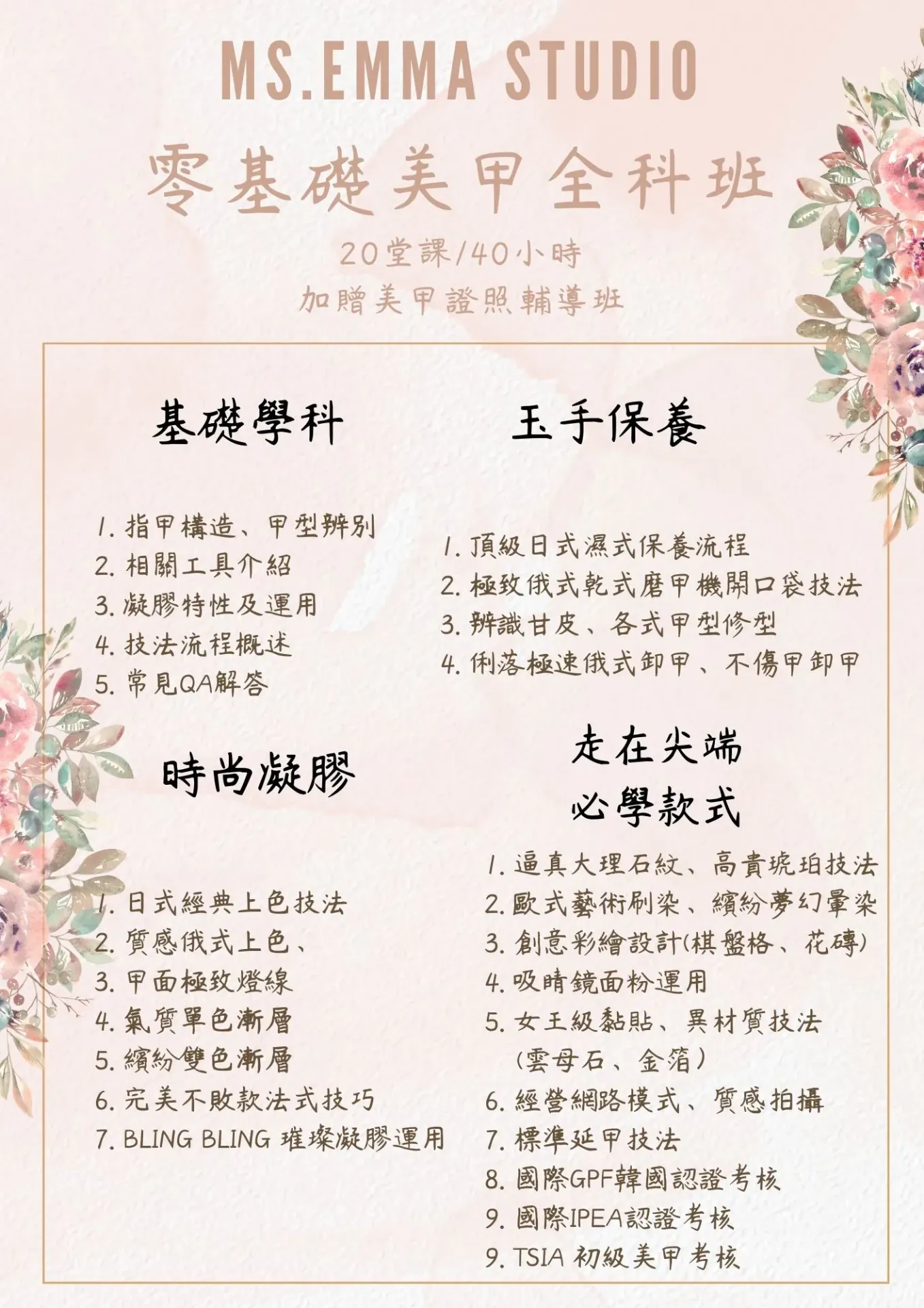 課程包含美甲、韓式皮膚管理、美睫、翹睫、熱蠟、採耳、國際證照輔導、國家美容丙乙級證照班