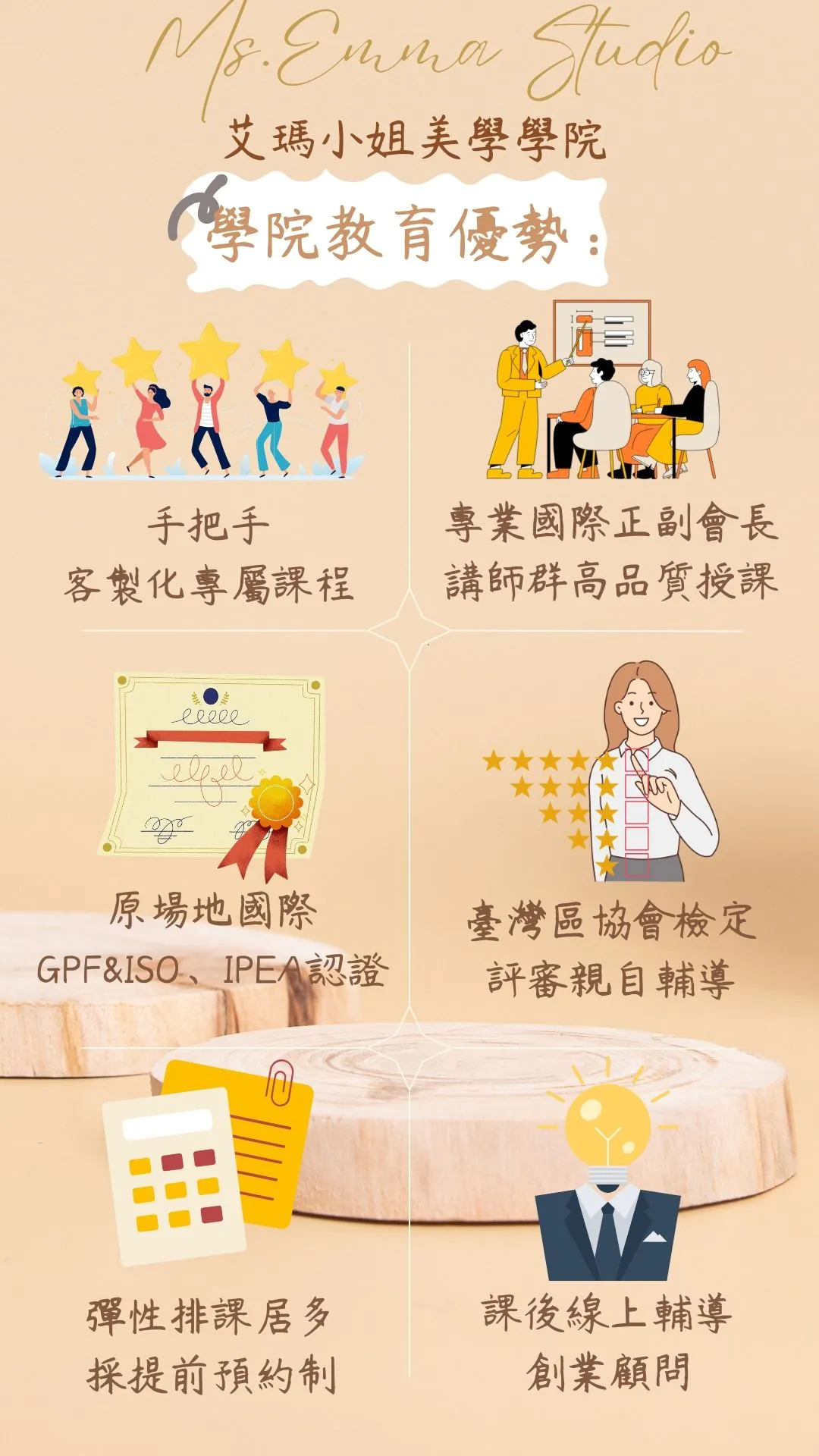 A : 台灣是個看重證照的國家,就像是你會騎車但你沒有駕照,直接上路總會擔心被開罰的一天。許多人或許會推廣技術重要,證照只是擺好看,但你想想哪天遇到客人突然詢問你是否有合格證照時你怎麼回答?還是直接跟他說技術比較重要?有些人看重證照的保證,擁有證照代表你有努力過,有到達程度之上才可以服務客人,擁有證照購買相關產品可享受的優惠也大不相同,在艾瑪這邊技術及證照皆看重,但為了幫學生省下荷包,將對於有報名全科班的學生贈送一張免費考照輔導,在外面你絕對找不到這樣的優惠🌹