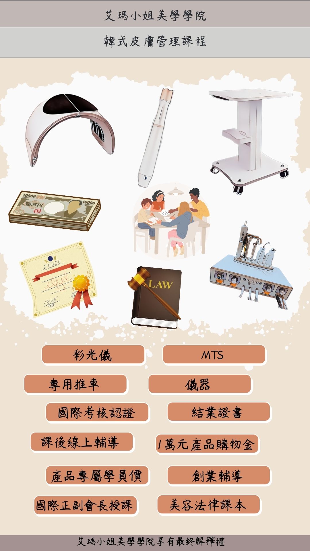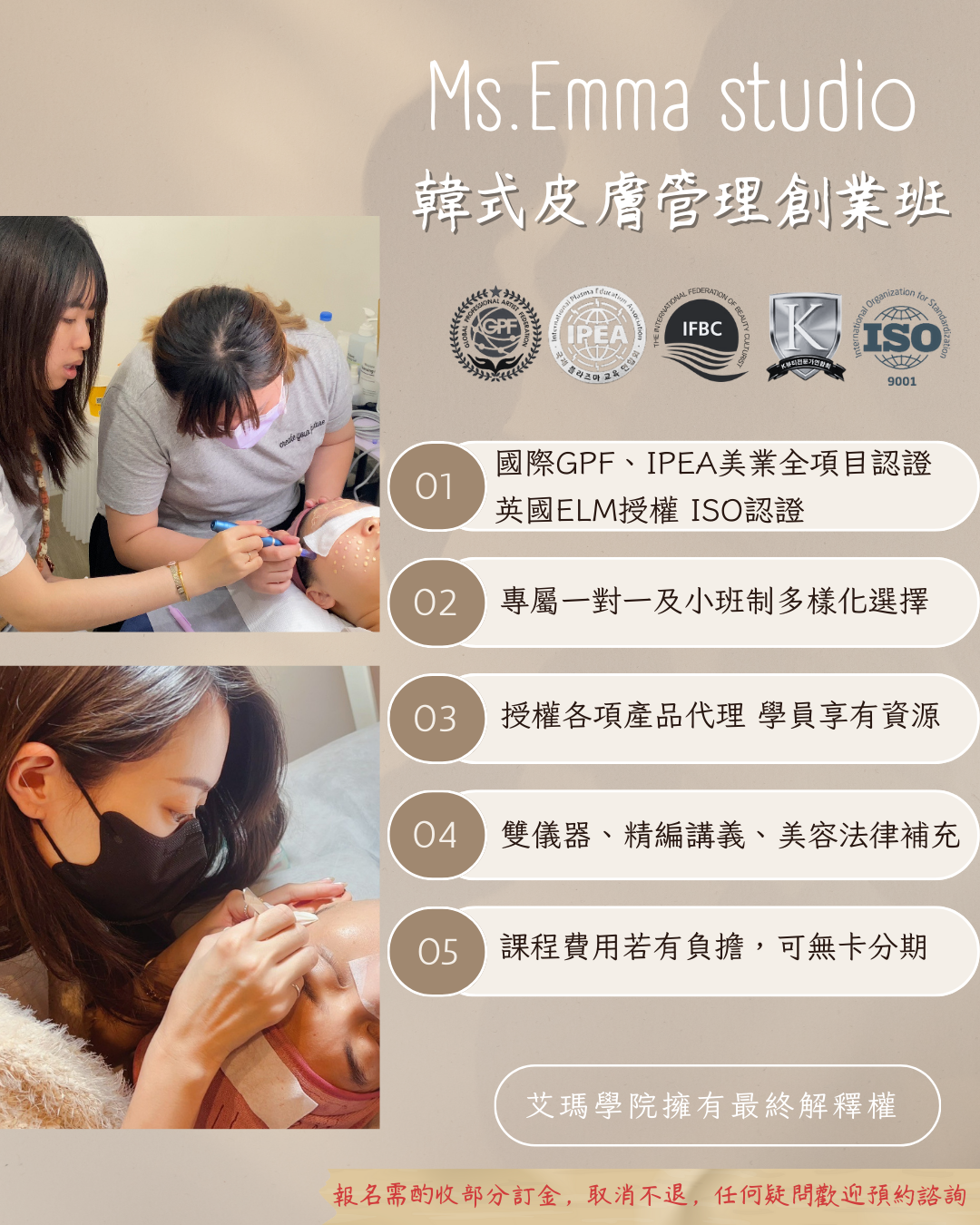A : 七探頭儀器有謠傳韓製及陸製之分,但其實大陸是世界代工廠,因此儀器基本上組裝、零件都是來自大陸,自稱韓製也只是套用品牌。 然而目前臺灣法規嚴格,不管是任何國家或品牌,只要是輸入臺灣都要事先申請衛生局檢驗,是否有牽涉醫療儀器,檢驗是非常難以取得。因此無論韓製陸製,臺灣目前市面上完全沒有合格的儀器。再者,國外的儀器往往沒有保固及品質保障,將造成開業美容師的困擾! 不過,艾瑪學院總監為學員們從臺灣的上市公司找到符合美容師操作的十探頭儀器,讓學員們開業有保障,且有一年的保固。