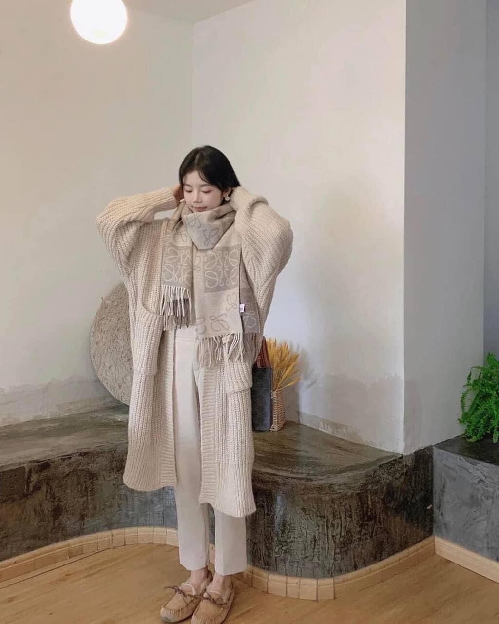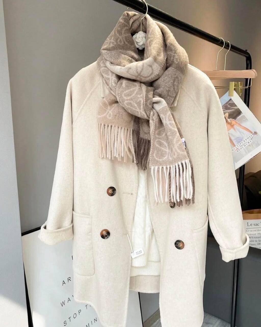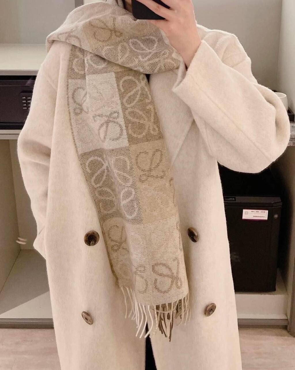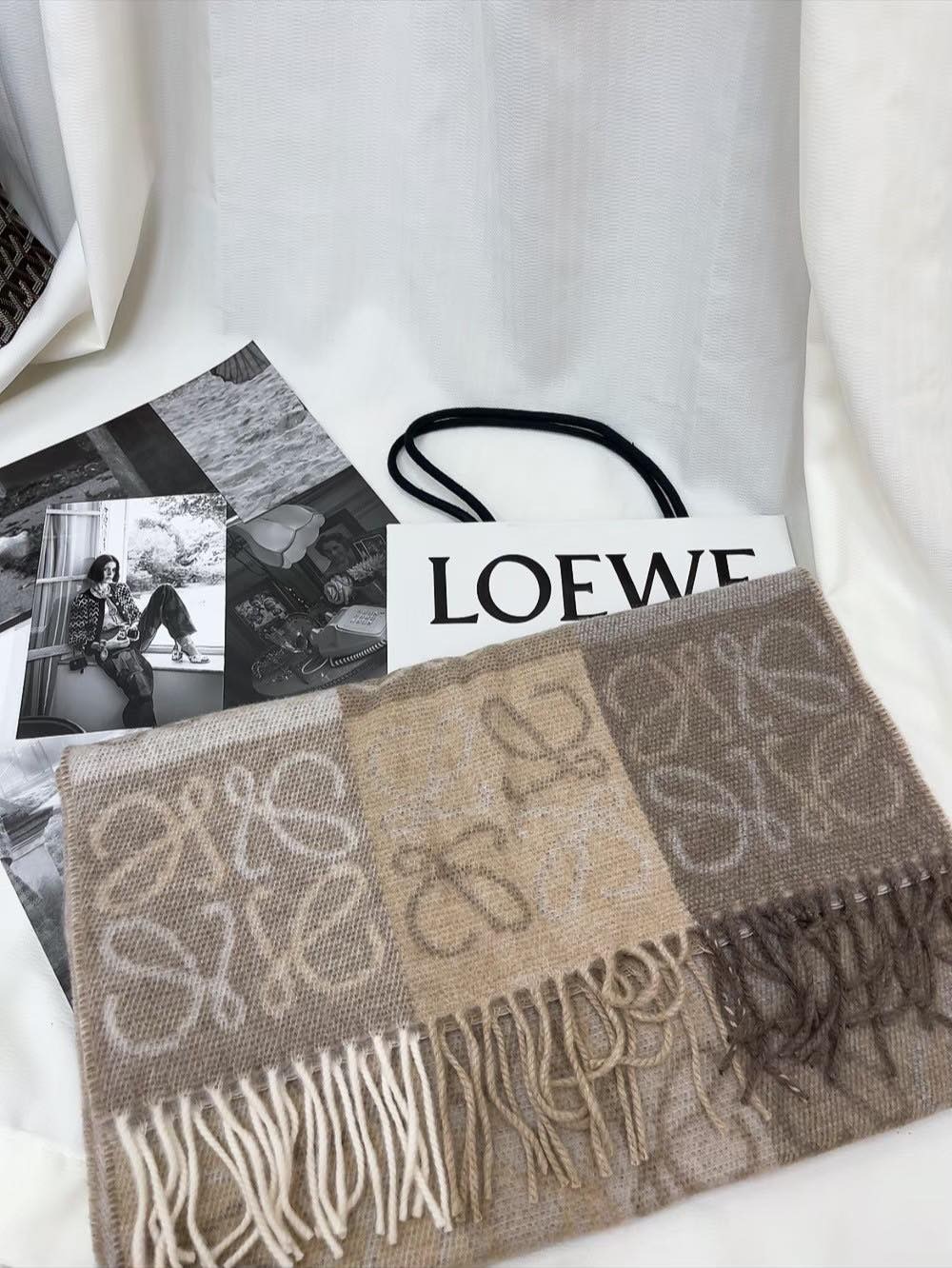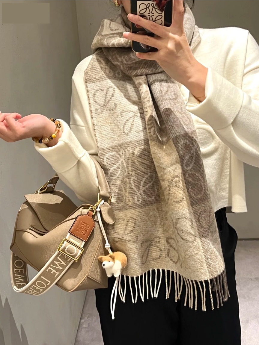 LOEWE 經典款 棋盤格圍巾 奶茶色 要買趁現在 秋冬搭配必備單品 顏色超級溫柔 好看又高級😍 有人一定覺得甚麼天氣誰買圍巾啊?! 但不現在買真的是漲價漲爆 年年漲價不誇張 台灣售價已經破$21000 📐180*38cm