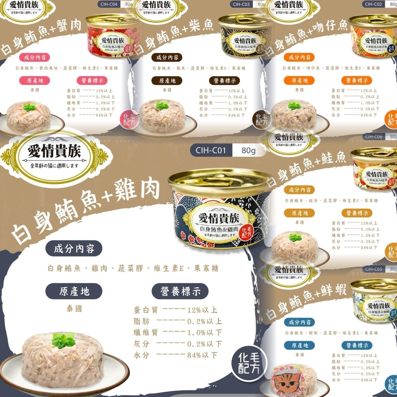 特色:選用特級白身鮪魚製成,添加吻仔魚均勻搭配,添加oligo寡糖,增進腸內菌叢平衡,維持免疫力,添加維他命E,低鹽分、低脂肪、高蛋白質,是貓咪的最愛 。