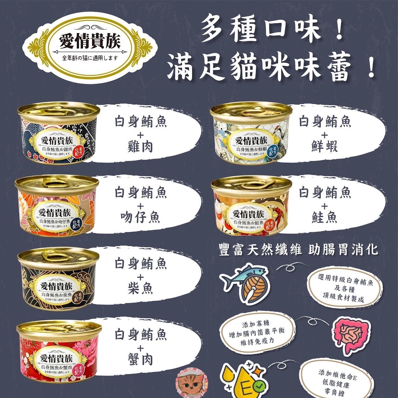 特色:選用特級白身鮪魚製成,添加新鮮蟹肉均勻搭配,添加oligo寡糖,增進腸內菌叢平衡,維持免疫力,添加維他命E,低鹽分、低脂肪、高蛋白質,是貓咪的最愛 。