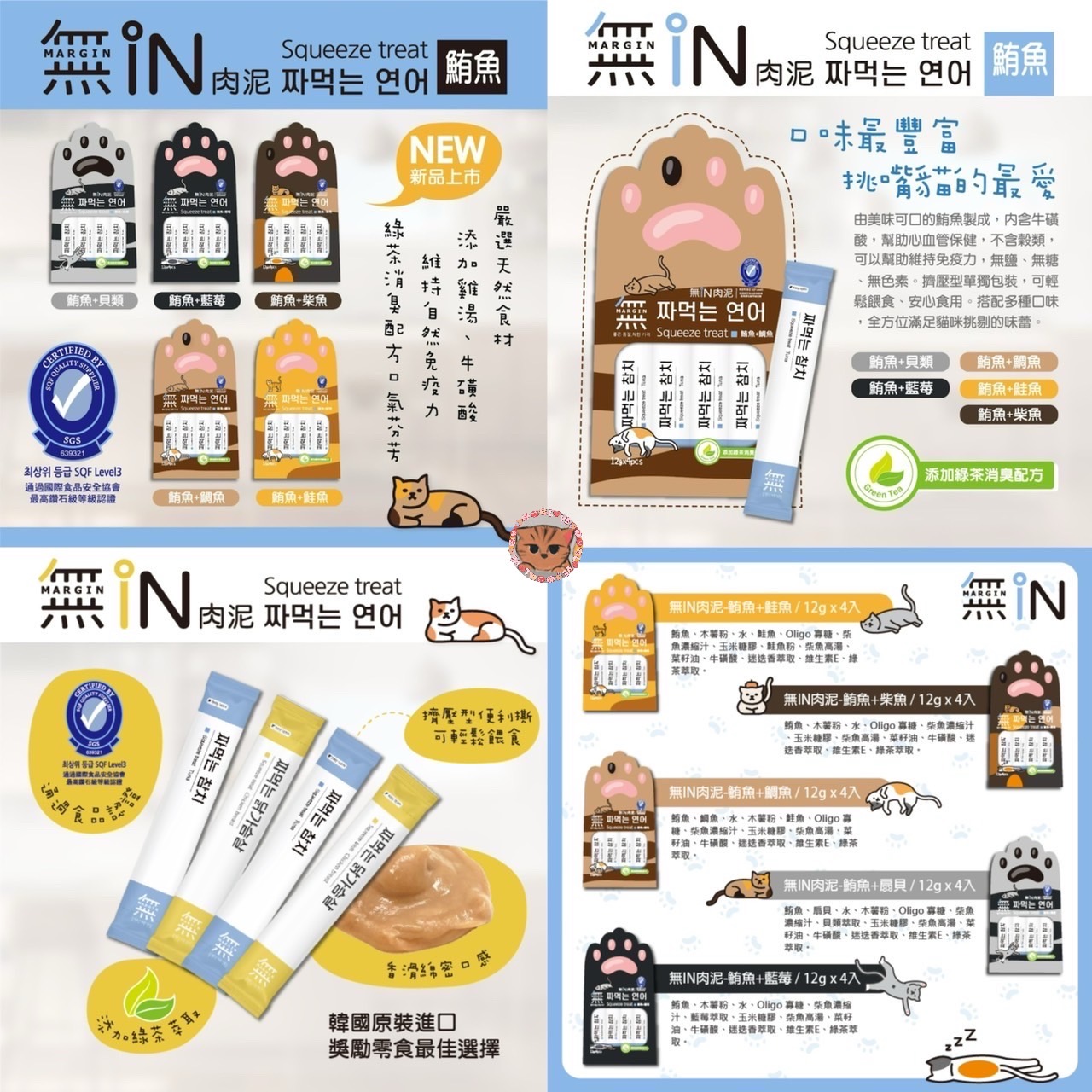 成分:鮪魚、鯛魚、水、木薯粉、鮭魚、Oligo 寡糖、柴魚濃縮汁、玉米糖膠、柴魚高湯、菜籽油、牛磺酸、迷迭香萃取、維生素E、綠茶萃取。