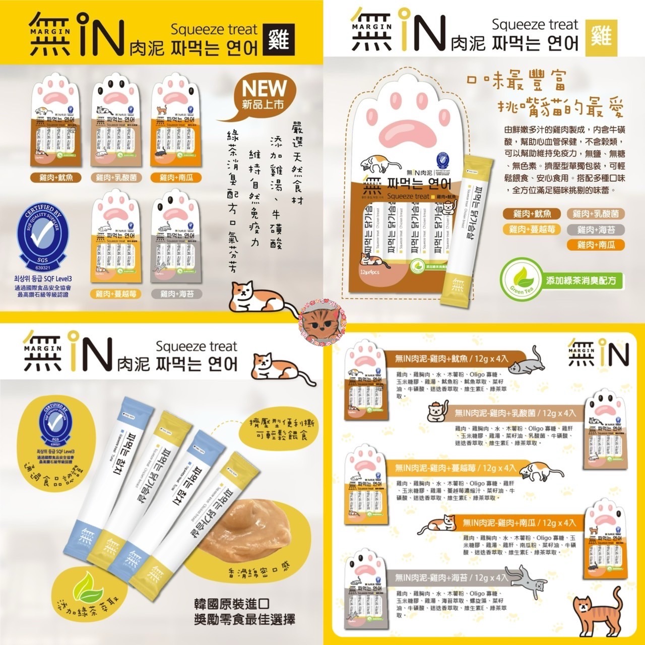 特色:鮮嫩多汁的雞肉添加鮮甜魷魚製成,內含牛磺酸,幫助心血管保健,不含穀類,可以幫助維持免疫力,無鹽、無糖、無色素。擠壓型單獨包裝,可輕鬆餵食、安心食用。搭配多種口味,全方位滿足貓咪挑剔的味蕾。
