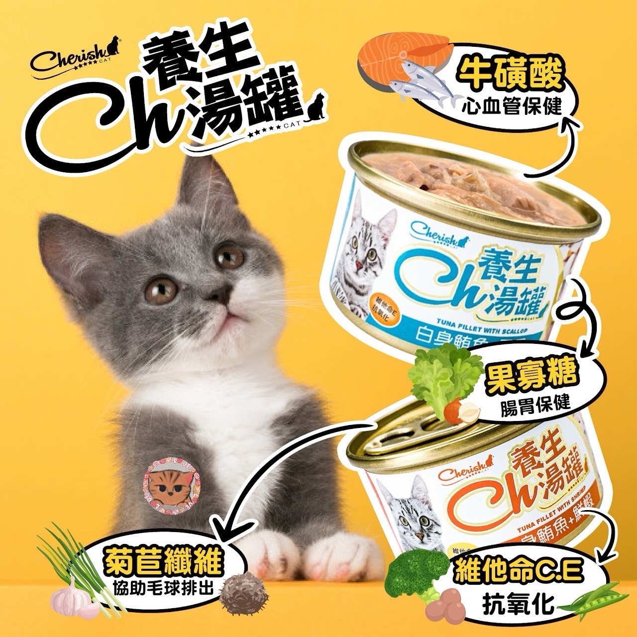 特色:採用特級白身鮪魚製成,添加干貝,含豐富的維他命C、維他命E、牛磺酸及菊苣纖維,具有化毛、維護腸道健康、幫助減少糞便氣味。