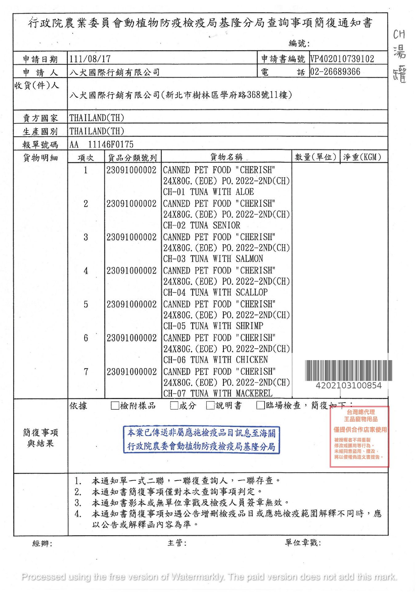 成分:白身鮪魚、鮮蝦、蔬菜膠、維他命C、維他命E、果寡糖、牛磺酸、菊苣纖維