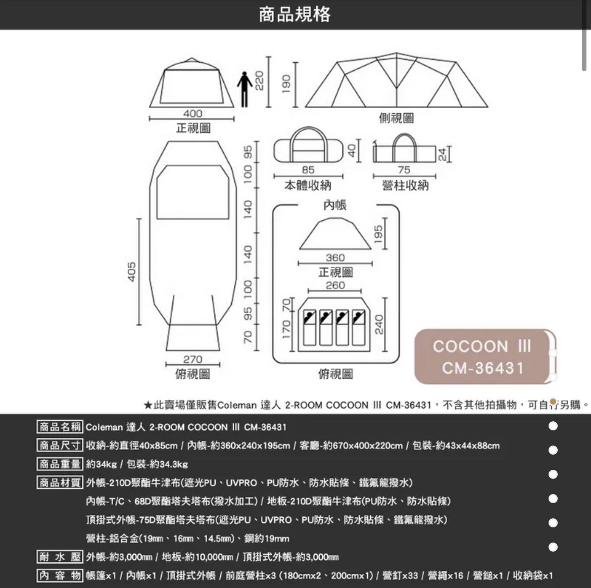 ★此賣場僅販售Coleman 達人 2-ROOM COCOON Ⅲ CM-36431,不含其他拍攝物,可自行另購。