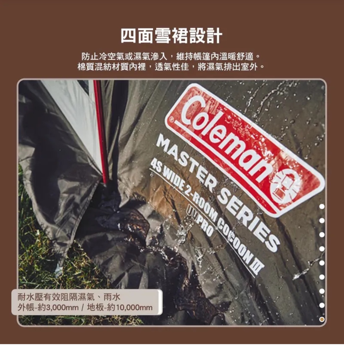 > 客廳天井網窗 > 四面雪裙設計 > 棉質混紡材質 > 透氣防潮防水性佳 【Coleman】達人 2-ROOM COCOON Ⅲ CM-36431 最頂尖的達人系列|四季全天候戶外高機能款 一房一廳2 ROOM帳蓬,超寬敞活動空間。