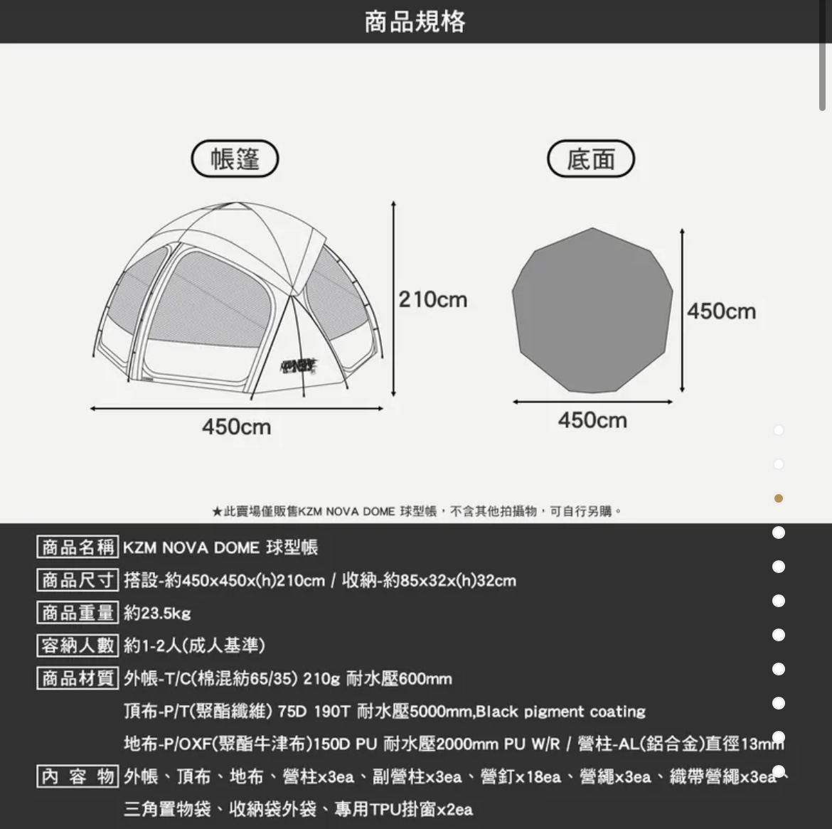 ★此賣場僅販售KAZMI KZM NOVA DOME 球型帳,不含其他拍攝物,可自行另購。