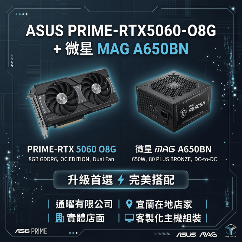 別擔心,我們為您配好了最完美的「無痛升級方案」! 最新世代 ASUS PRIME RTX 5060 8G 顯示卡,搭配 MSI MAG A650BN 650W 銅牌電源,效能與穩定度的黃金交叉,1+1 組合價讓您省去比價煩惱,荷包與效能一次兼顧!