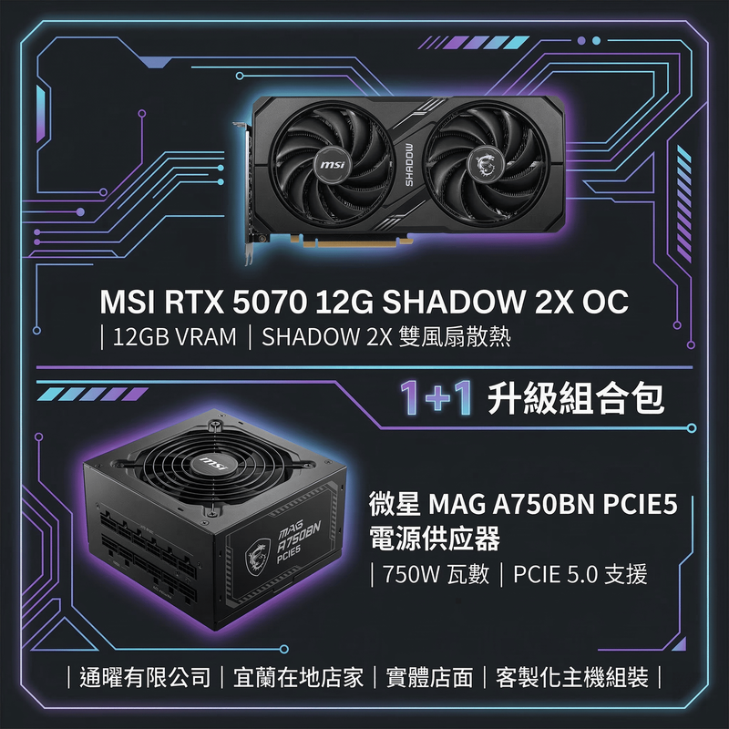 別煩惱了!我們為您準備了最完美的「顯卡 + 電源 1+1 無痛升級組合包」!一次帶走微星最新 RTX 5070 顯示卡,搭配原生支援 PCIE5 的 750W 穩健電源。不用再苦惱線材轉接與供電不足的風險,一套換好,戰力直接飆滿!現在下單即享 1+1 專屬超殺組合價!