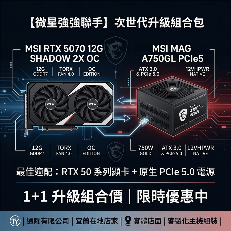 專為追求極致效能與穩定性的玩家設計。微星 RTX 5070 12G SHADOW 2X OC 顯卡,帶您領略次世代光線追蹤與 AI 繪圖的震撼;搭配專為新一代顯卡誕生的 MAG A750GL PCIe5 電源,原生支持 12VHPWR 接口,省去轉接煩惱,提供最純淨、穩定的電力供應。