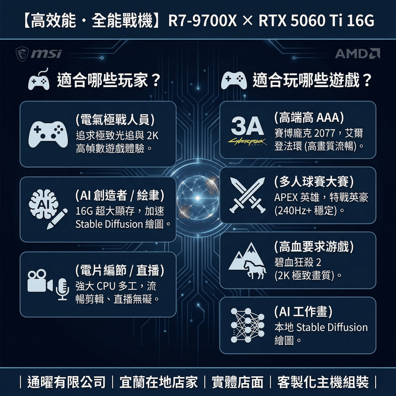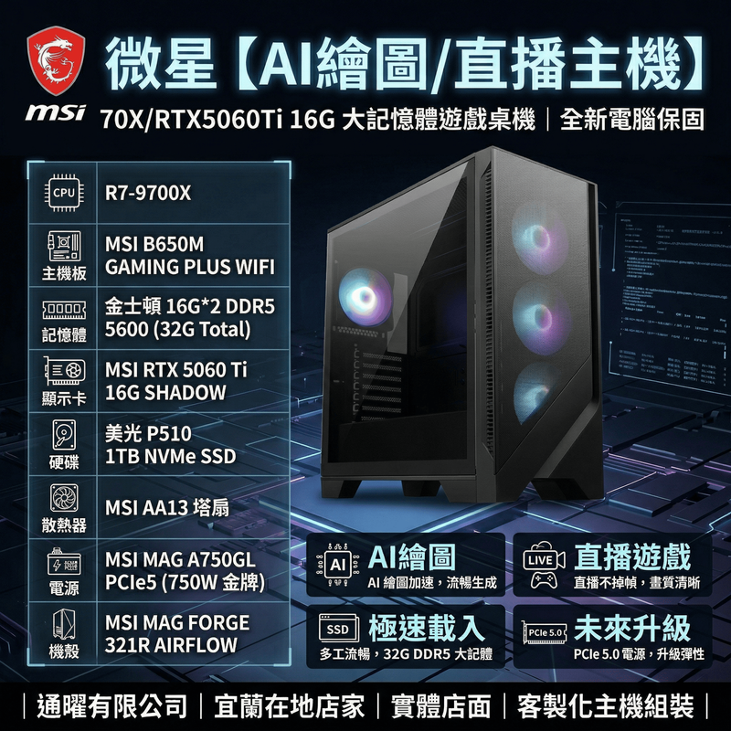 🔥 全新世代核心,為 2K 遊戲與 AI 運算而生! 尋找一台能稱霸 2K 遊戲戰場、同時具備強大 AI 運算與影音剪輯能力的完美主機嗎?本機精選最新 AMD Ryzen 7 9700X 處理器與搭載 16GB 大容量記憶體的 RTX 5060 Ti 新世代顯卡,搭配微星全家桶生態系,給您最極致的效能與最穩定的散熱表現! 本店商品一律開立發票(含稅)