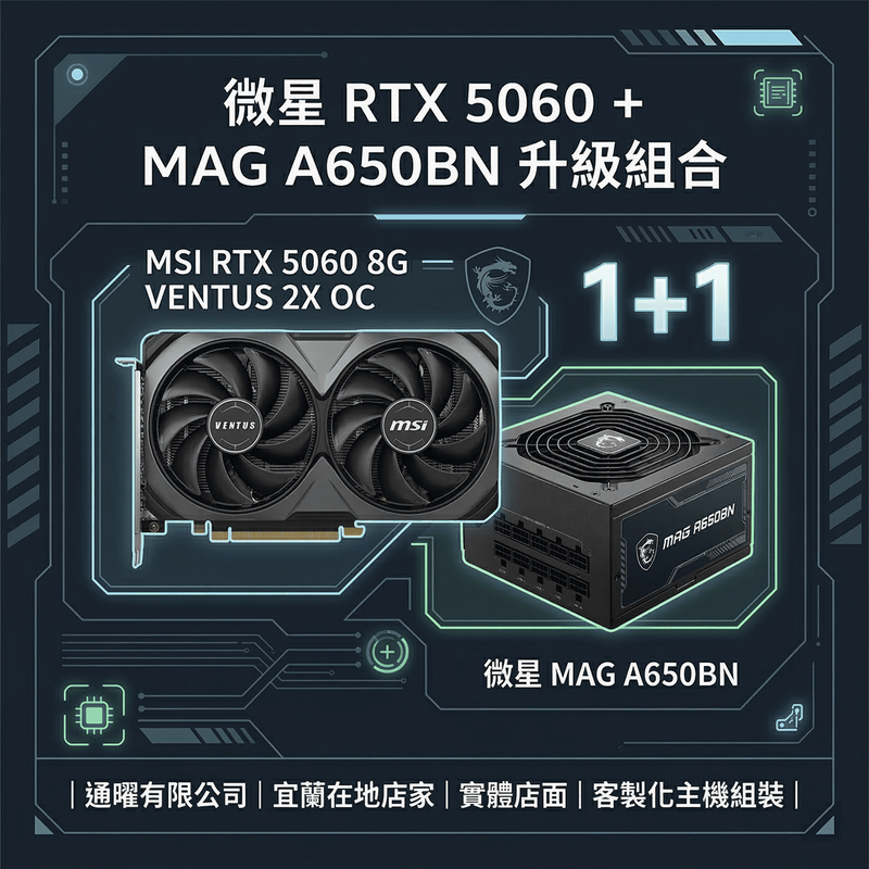 或者正準備組裝一台高 CP 值的主流電競主機? 別煩惱了!微星為玩家精選「主流神兵 + 穩健動力」1+1 升級組合包。不用再費心計算瓦數與相容性,一次帶走最新 RTX 5060 顯示卡與 650W 銅牌電源,讓你省時、省心、更省荷包!