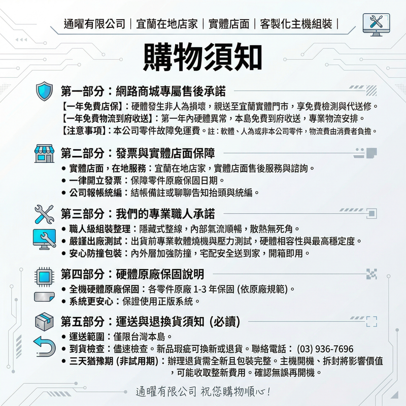 - 實體店面,在地服務:我們是 通曜有限公司(宜蘭在地店家),提供實體店面售後服務與客製化組裝諮詢。