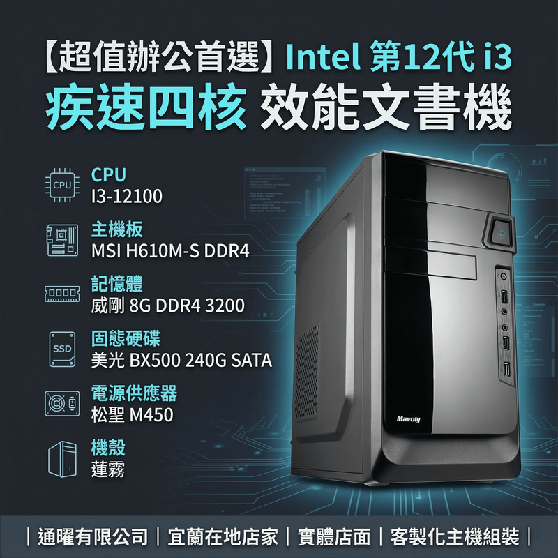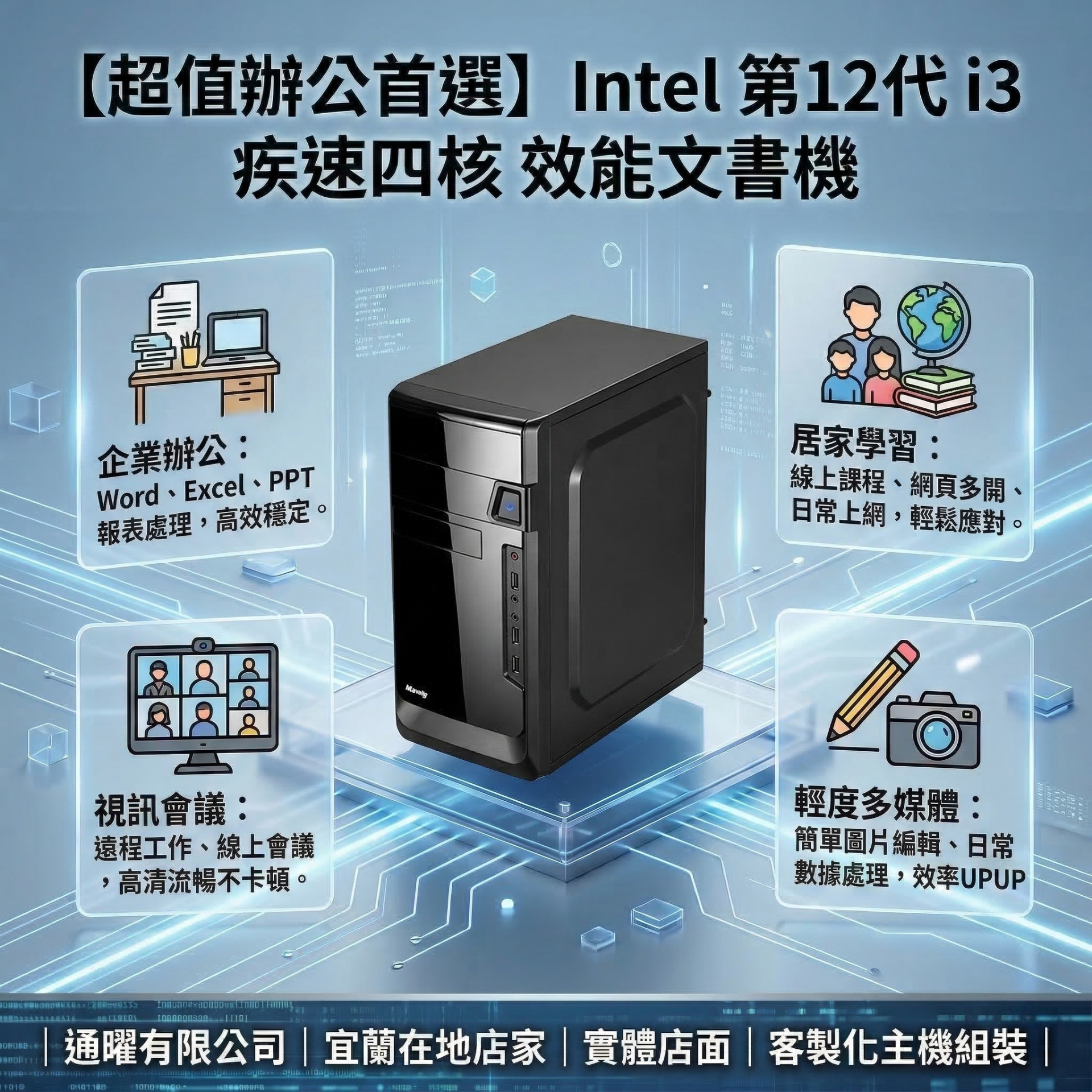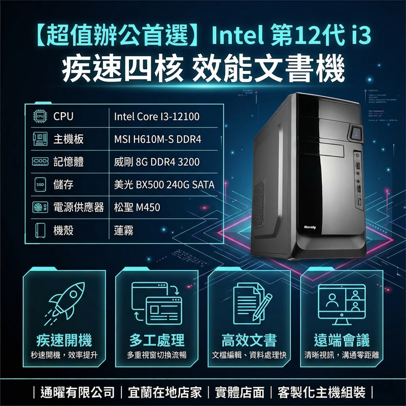 還在忍受老電腦開機慢、網頁轉圈圈嗎?這台主機為您精選一線大廠零組件,搭載 Intel 第12代強悍處理器與高速固態硬碟,無論是報表處理、線上視訊、還是追劇看片,都能給您絲滑順暢的極致體驗。花最少的預算,享受最實在的效能!