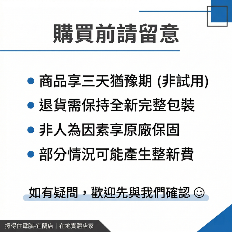 - 到貨檢查:收到商品請儘速檢查。若發生新品瑕疵,可申請換新或退貨,請直接電話聯繫:(03) 936-7696。