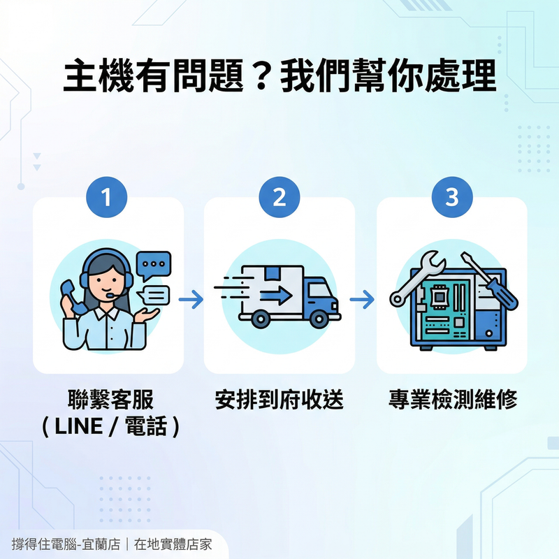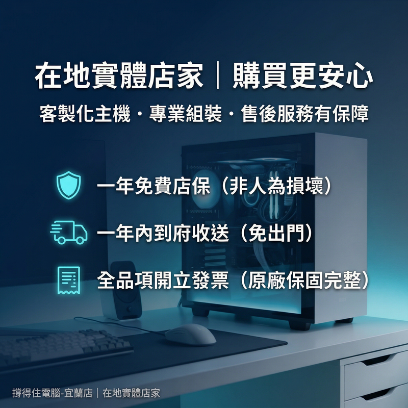 - 【一年免費店保】 自購買日起一年內,若主機硬體發生非人為損壞,親送至宜蘭實體門市,我們將提供免費的檢測與代送修服務。