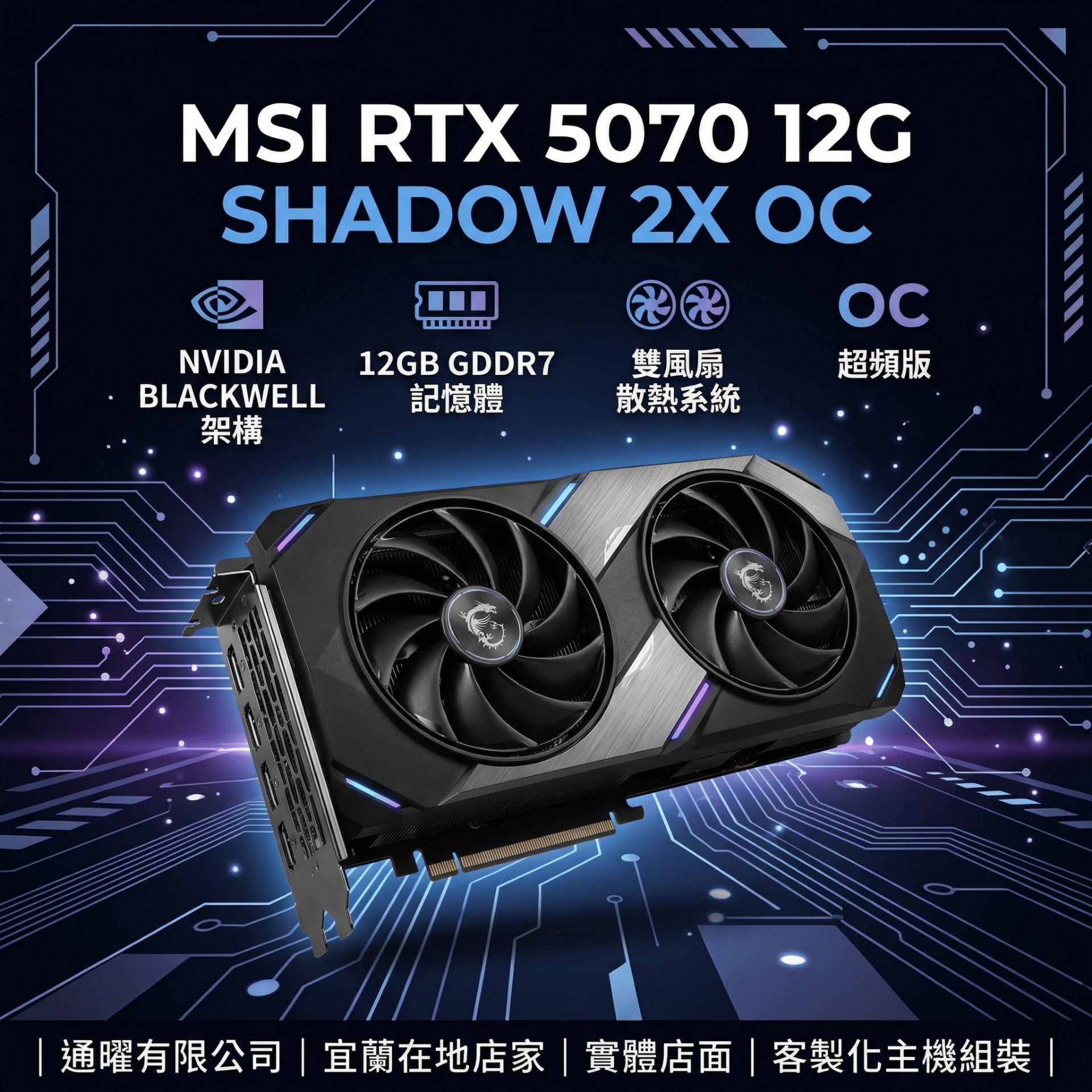 🌑 闇影潛行,效能制霸|次世代 2K/4K 遊戲首選 🌑 不追求浮誇,只專注於純粹的強悍。全新 MSI SHADOW 2X 顯示卡以洗鍊的闇影黑化美學,結合 NVIDIA 最新 Blackwell 架構,在極致靜音與爆發效能間取得完美平衡。緊湊的雙風扇設計,讓強大算力也能輕鬆融入您的專屬主機! 本店商品一律開立發票(含稅)