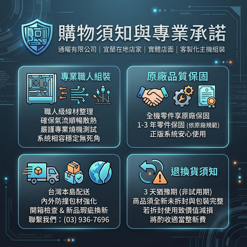 - 實體店面,在地服務:我們是 通曜有限公司(宜蘭在地店家),提供實體店面售後服務與客製化組裝諮詢。
