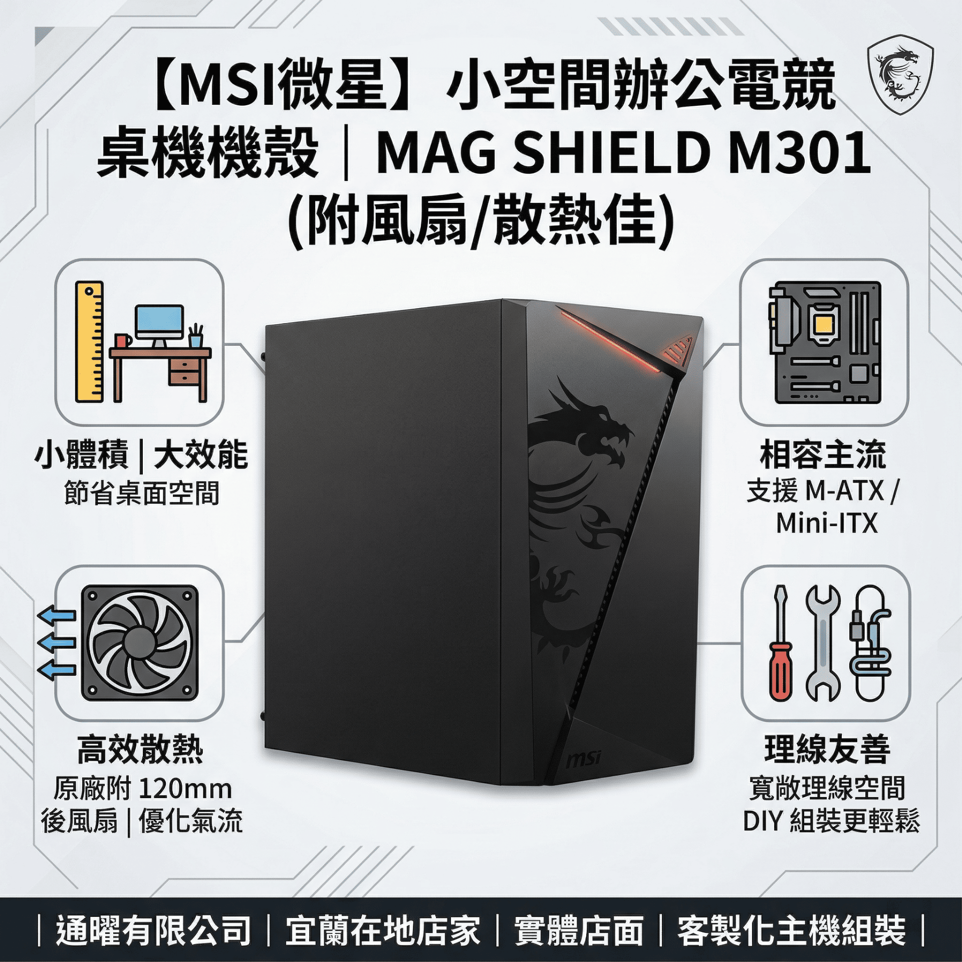 小巧俐落,擴充不設限!打造你的專屬戰鬥基地 空間有限,但對效能的追求絕不妥協!MSI MAG SHIELD M301 是一款專為緊湊空間設計的 Micro-ATX 塔型機殼。它以極簡俐落的外觀,結合高度實用的硬體擴充性,成為打造高性價比入門電競主機或高效能辦公電腦的理想選擇。 本店商品一律開立發票(含稅)