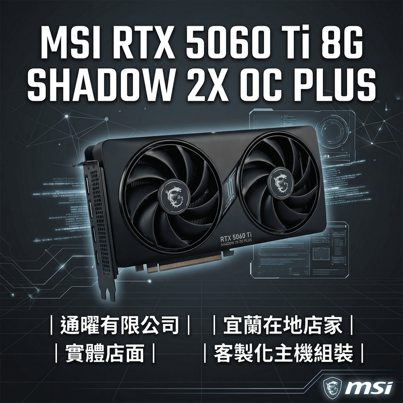 升級電競體驗,暗影效能覺醒! 全新微星 MSI RTX 5060 Ti 8G SHADOW 2X OC PLUS 震撼登場。專為次世代遊戲與 AI 運算打造,提供卓越的 1080p 與 1440p 遊戲性能。搭配沉穩內斂的「SHADOW」極簡黑化雙風扇設計,讓您的主機不只冷酷,效能更狂暴! 本店商品一律開立發票(含稅)
