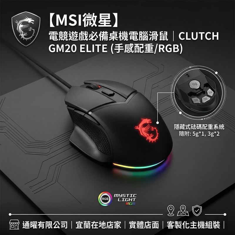 掌握精準,主宰戰局! MSI CLUTCH GM20 ELITE 專為渴求勝利的玩家打造。搭載強大光學傳感器與獨家砝碼配重系統,讓你的每一次點擊與滑動都如臂使指。不論是激烈的 FPS 射擊還是需要細膩操作的 MOBA,它都是你不可或缺的致勝武器! 本店商品一律開立發票(含稅)