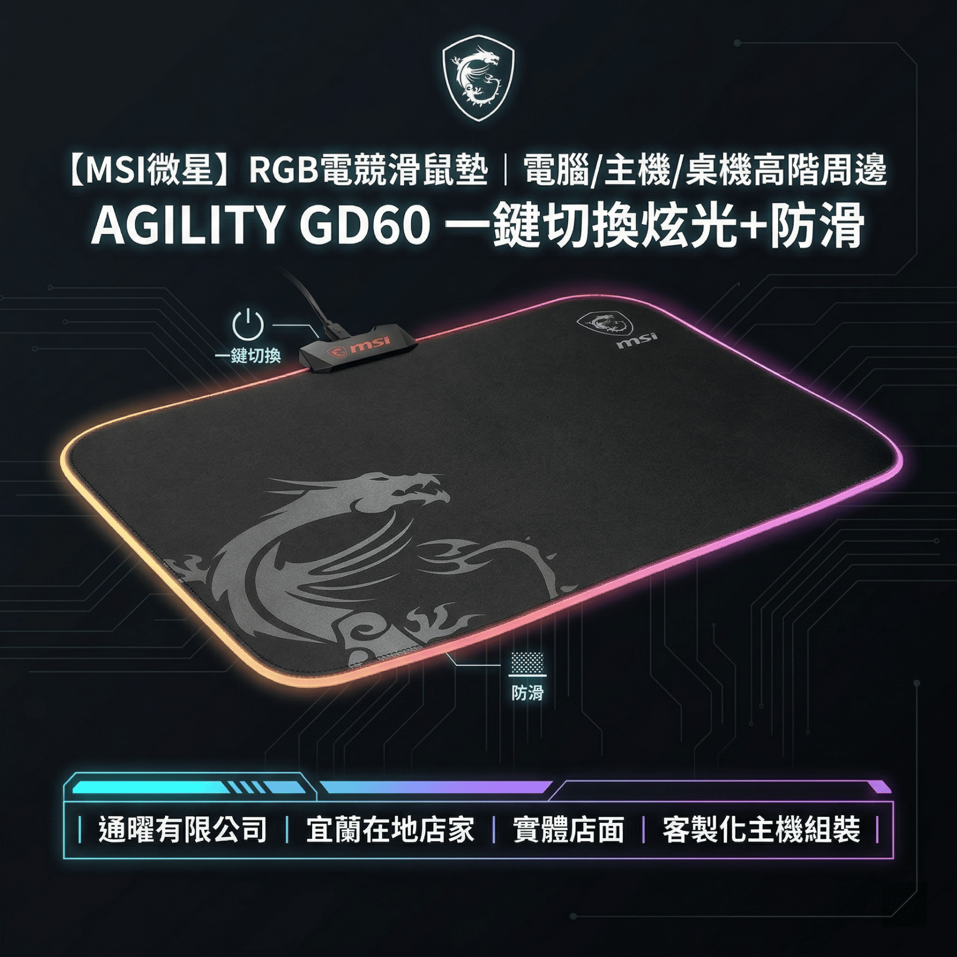 點亮你的電競王國! MSI AGILITY GD60 專為追求極致操作與沉浸式氛圍的玩家打造。微紋理紡織表面提供絲滑流暢的滑動體驗,搭配炫目的 RGB 燈效與直觀的單鍵切換設計,讓你的桌面瞬間化身專業電競舞台,每一次出擊都充滿儀式感! 本店商品一律開立發票(含稅)