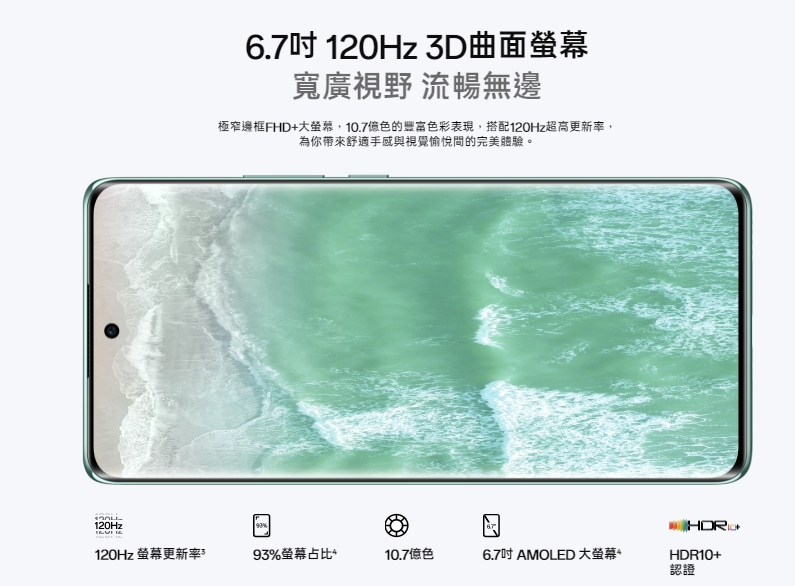 6.7吋極窄邊框FHD+大螢幕 極致輕薄機身,量身打造,舒適握感 120Hz超高更新率及10.7億色彩 5000萬像素,OIS主鏡頭 3200萬像素,黃金焦段人像鏡頭 67W 超級閃充