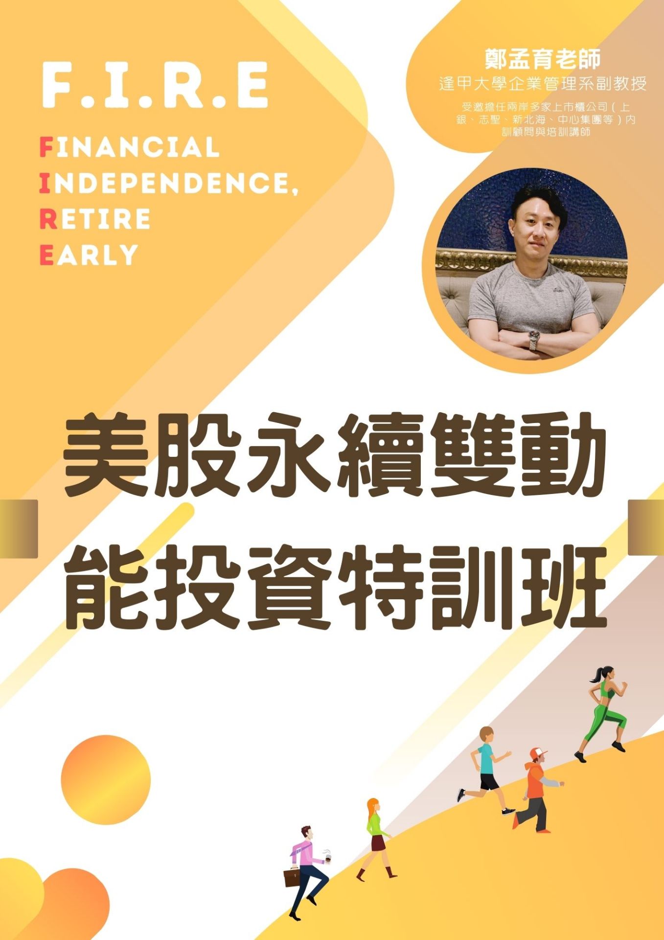 本系列之講座是由逢甲大學企管系鄭孟育老師以手把手的教學與經驗分享,提升您正確的投資觀念,藉由不斷買入好資產,打造高效率被動收入的投資心法,瞭解並精通掌控金錢的運作,使您成為金錢的主人,不再受金錢控制,更讓您早日實現財務自由的夢想。