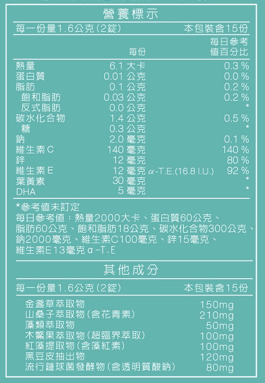 成分:山桑子萃取物(含花青素)、葡萄籽萃取物、專利金盞草萃取物(含葉黃素與玉米黃素)、維生素C、黑豆皮抽出物(日本專利)、紅藻提取物(含藻紅素)、木鱉果粉(超臨界萃取)、黑醋栗萃取物、流行鏈球菌發酵物(含透明質酸鈉)、葡萄糖酸鋅、藻類萃取物(含DHA)(荷蘭專利)、枸杞萃取物、葡萄濃縮粉(葡萄濃縮汁、麥芽糊精)、維生素E、硬脂酸鎂、蘋果酸、蔗糖素。