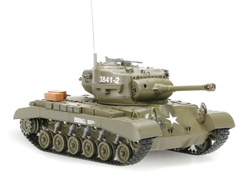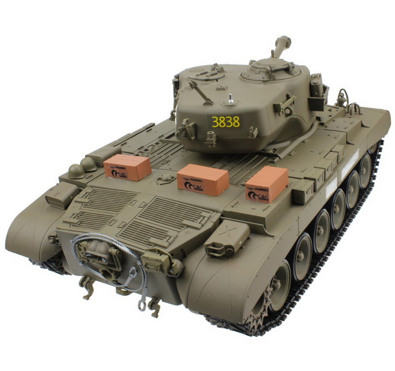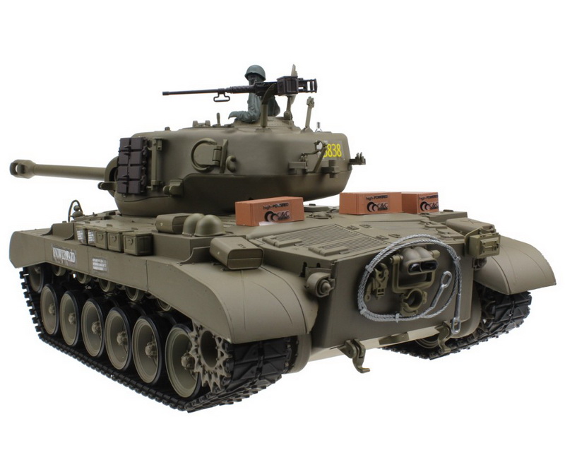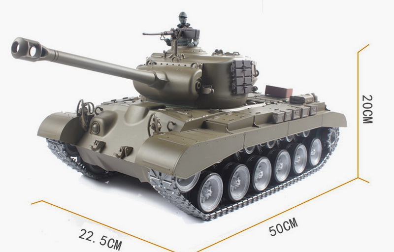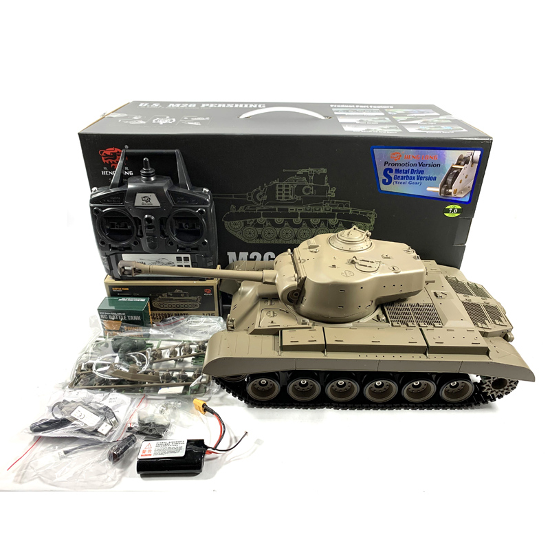 M26潘興戰車(M26 Pershing),是美國於第二次世界大戰和韓戰時期的中型戰車,它延續了M4雪曼用美國名將命名的傳統,以第一次世界大戰的名將約翰·潘興為名。由於其均衡的火力、裝甲和機動性,歷史學家Richard Hunnicutt將其列為二戰第二優秀的戰車,僅次於豹式戰車。恆龍最新1:16美軍M26中型二戰坦克(3838),本款坦克已更新為最新7.0版重型坦克,主控板新增4種音效,前車燈以及後車燈均可遙控開或關,坦克全方位行驶,可以在遙控器上面進行遙控微調,另開炮時的後座力可以三檔力度可調,主板可以支持3S鋰電池並預留部分燈光插口,砲塔旋轉可微調,遙控器改為6顆3號電池,本款完全仿真有機槍、油箱、廢棄排放系統、建防禦土木工具、散熱系統、砲塔、炮管、人員出入蓋口等等各種精細逼真之車身配件,車尾裝置有煙霧排放口(有開關可控制)並可調整坦克行進音量及模擬機槍射擊聲效及坦克引擎聲還有模擬炮彈發射時之後作力及其音效、真實地顯現坦克開動時的情景,主炮是自動裝填式的電動炮(具有彈道改良系統),炮塔可作左/右各160度轉變方向,炮管可以上下30度運動,行進及停止時可以遙控發射BB彈,最大射程約25米。採用履帶驅動有九組履帶驅動輪各傳動輪都有避震系統,並配置(全驅動輪懸系統)內含差速裝置,可高速移動,最大攀爬角度達35度,動作敏捷可征服不同路段,多功能九段式專業遙控器有三個遙控頻道及金屬搖控桿,完全模擬真實坦克動作有多達24種同時操控動作及坦克聲音,超強馬力配備7.2V大電流電池操控扭力十足。擬真度超高,性能驚人。