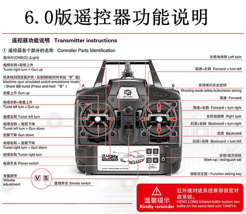 恆龍最新款蘇聯二戰坦克KV1(3878)能冒煙、發射BB彈且帶有逼真的聲音(如模擬機槍射擊聲效及坦克引擎聲還有模擬炮彈發射時之後作力、真實地顯現坦克開動時的情景,主炮是自動裝填式的電動炮(具有彈道改良系統),炮塔可作左/右各160度轉變方向,炮管可以上下30度運動,行進及停止時可以遙控發射,BB彈,最大射程約25米。採用履帶驅動有九組履帶驅動輪各傳動輪都有避震系統,並配置(全驅動輪懸系統)內含差速裝置,可高速移動,最大攀爬角度達35度,動作敏捷可征服不同路段,多功能九段式專業遙控器有三個遙控頻道及金屬搖控桿,完全模擬真實坦克動作有多達24種同時操控動作及坦克聲音,超強馬力配備7.2V大電流電池操控扭力十足,擬真度超高,性能驚人!