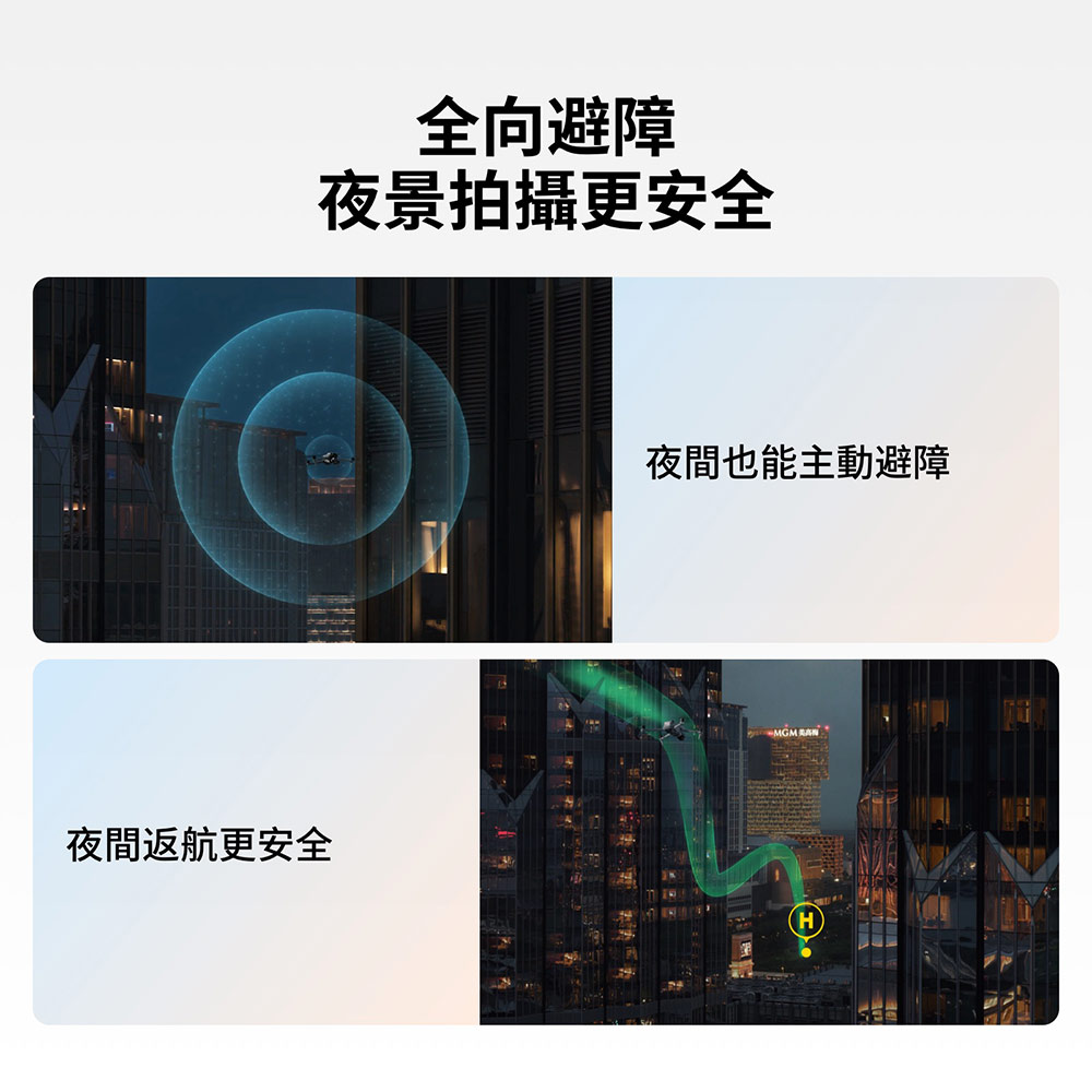 新一代智能返航 返航更精準 夜景級全向主動避障 雙攝4K/60fps HDR 影片14級動態範圍